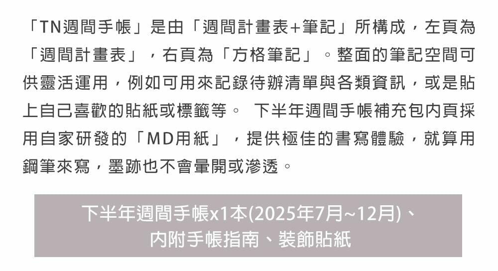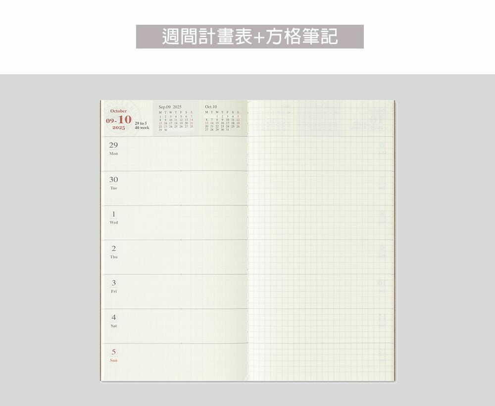 ✰ 左週右記的橫式週計畫編排,可以清楚看見整週的日程規劃,右側搭配大面積方眼筆記頁書寫空間,清晰有質感的記事方式,自由使用風格不受限!