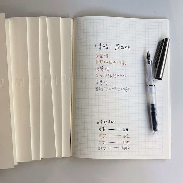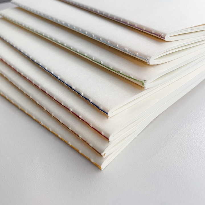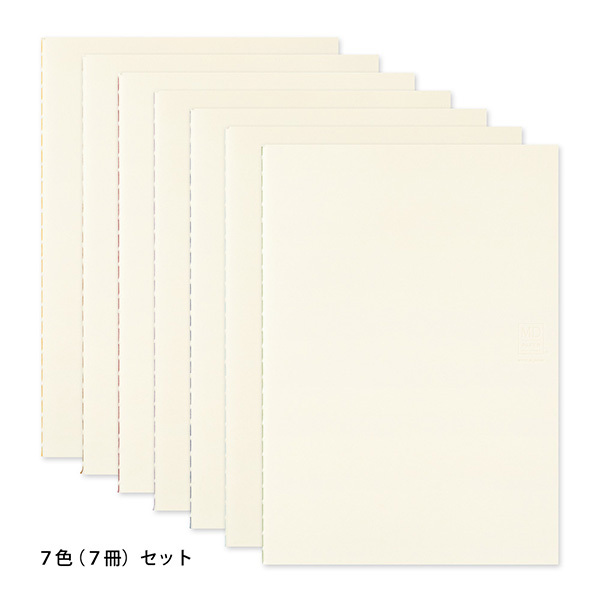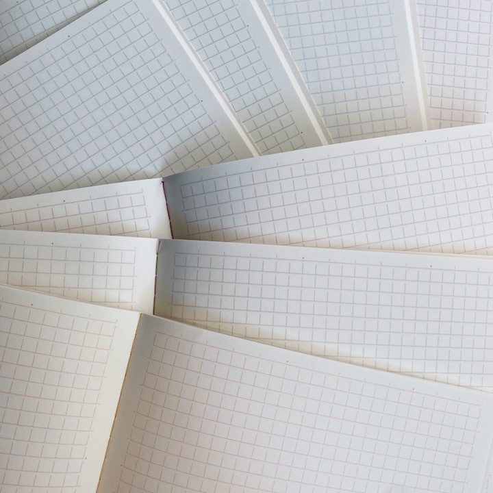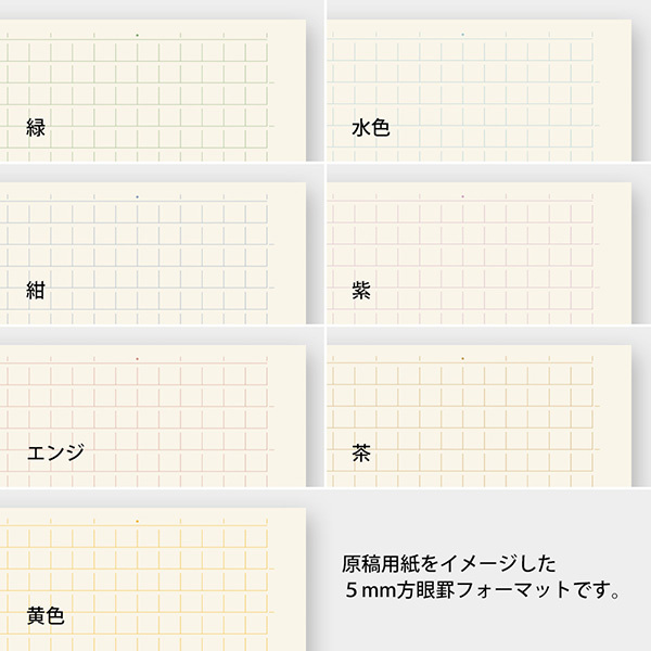 內頁選用與日式稿紙相仿的5mm方格設計,每冊搭配不同顏色,一組七本共有七種色彩。