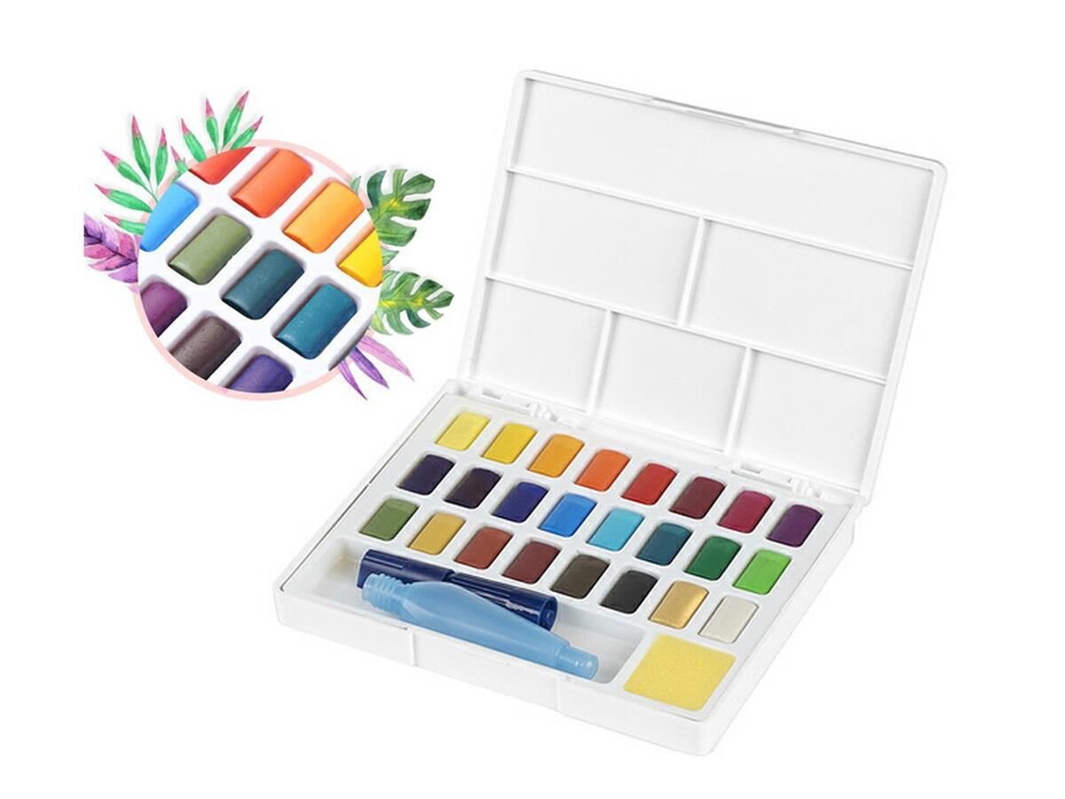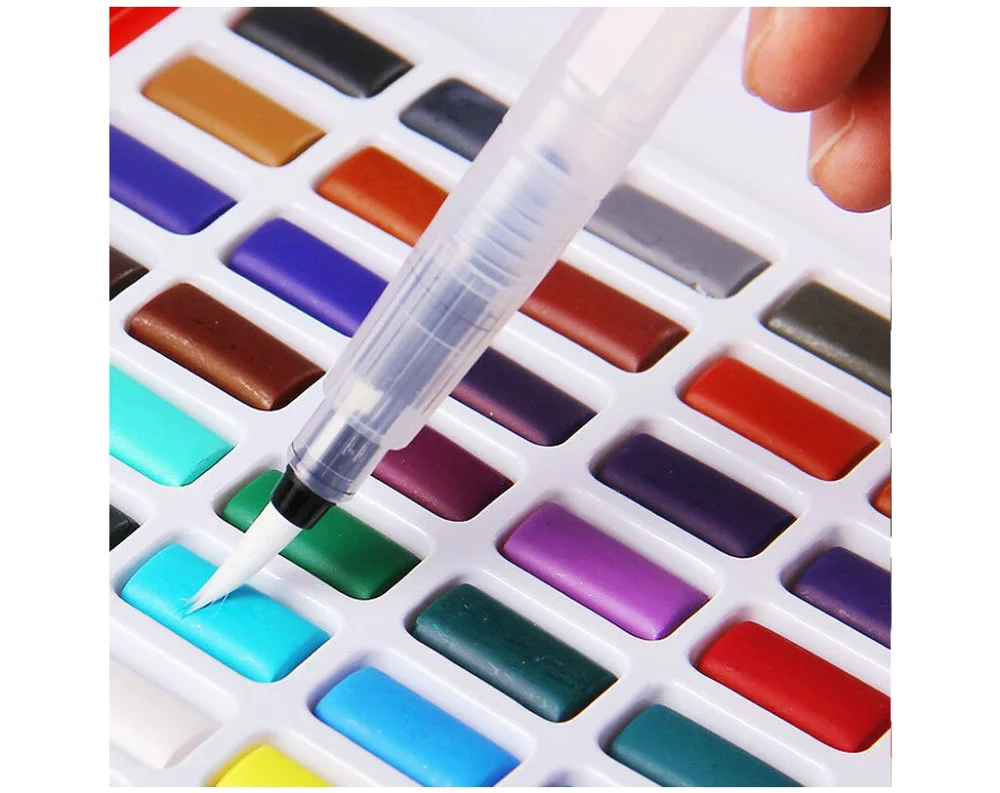 乾燥的塊狀水彩,用濕潤的筆輕抹即可溶解作畫,畫完直接蓋上盒蓋放入隨身包包,攜帶方便。