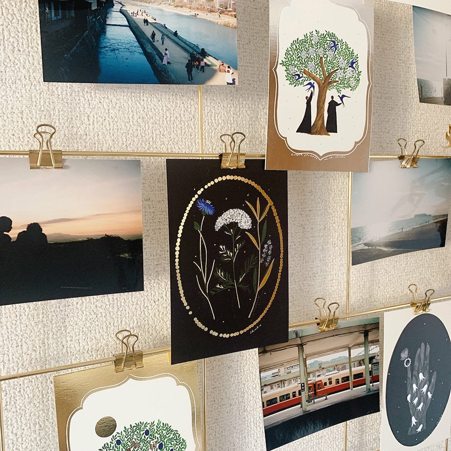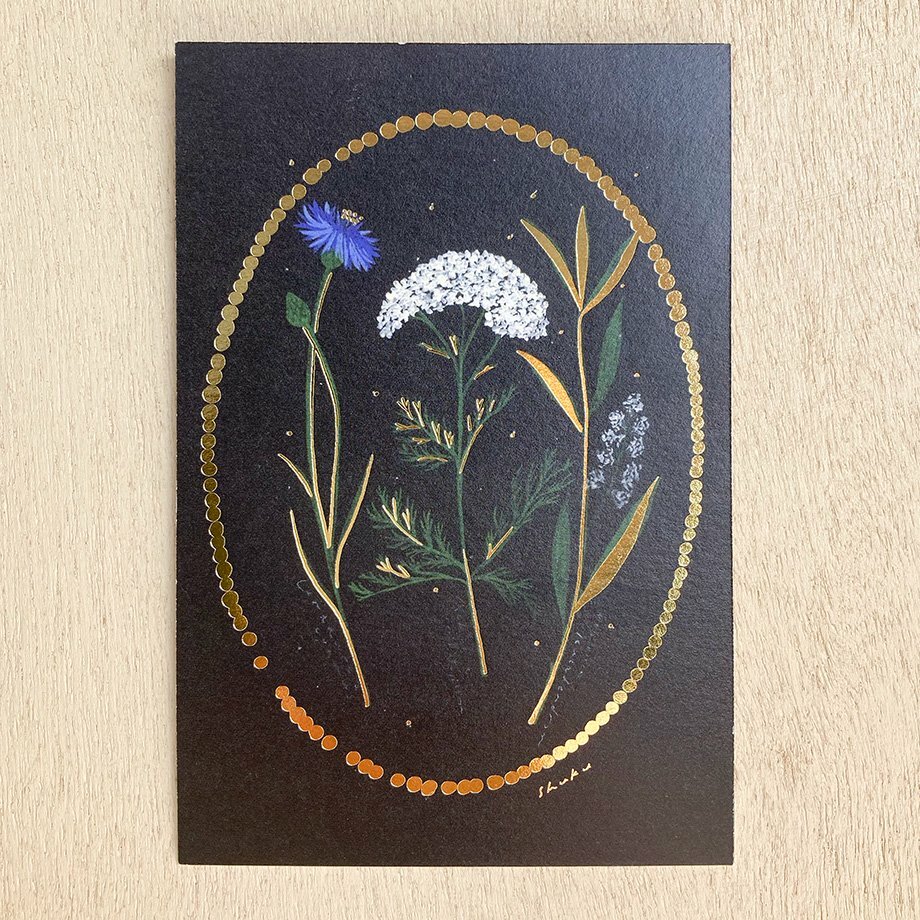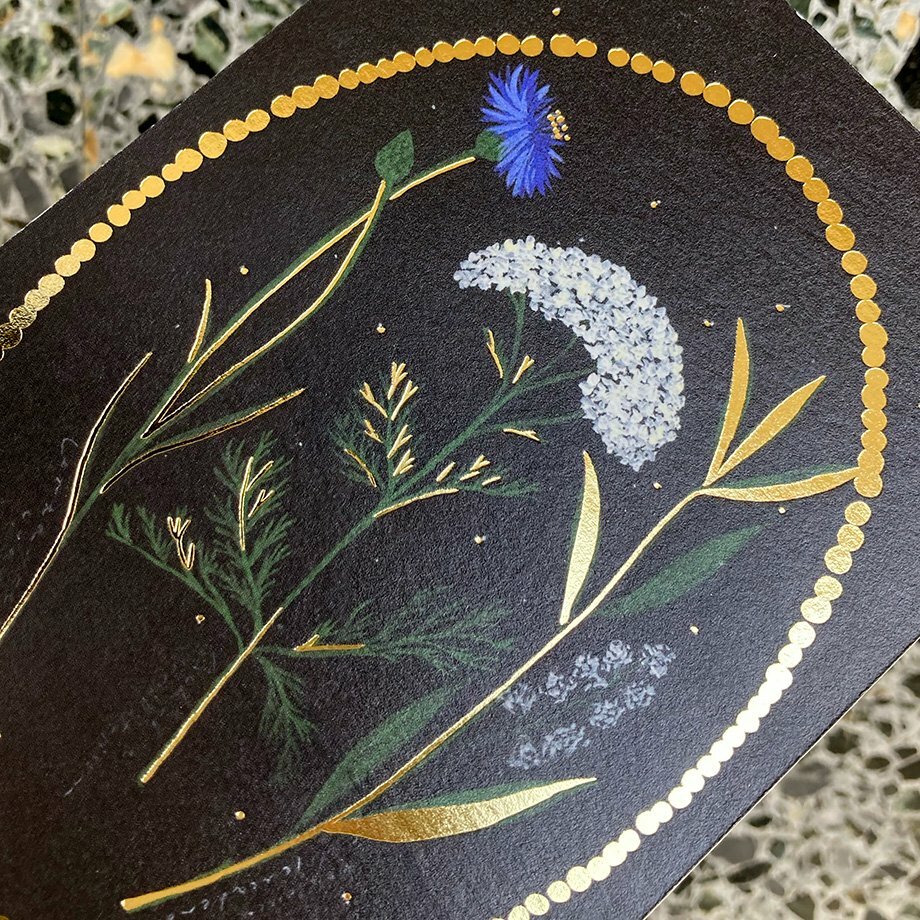 精緻的金箔壓印閃閃發光, 背面也是彩色印刷,讓明信片更有質感