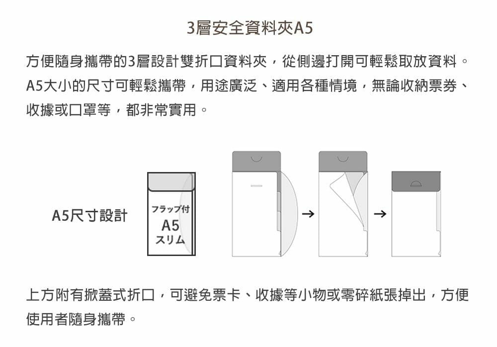 A5大小的尺寸可輕鬆攜帶,用途廣泛、適用各種情境,無論收納票券、收據或口罩等,都非常實用。