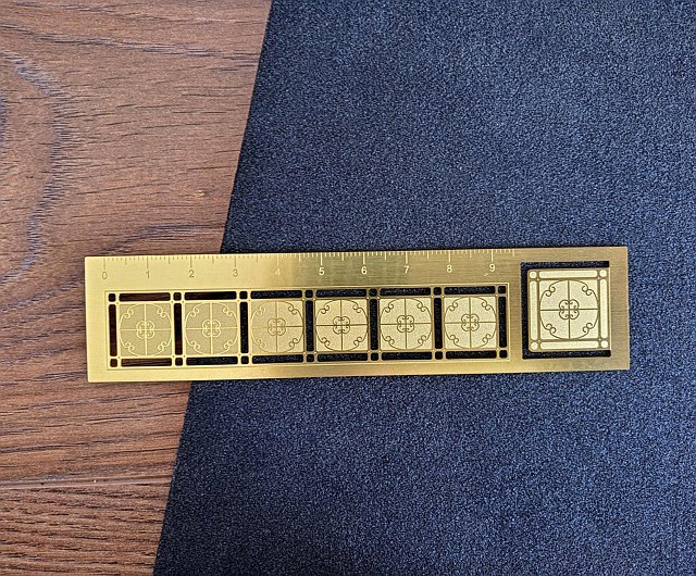 以老屋窗花為設計元素 輔以精密金屬蝕刻工藝,並加入噴砂工法,希望藉由窗花元素的引入,將工具尺提升到更美的層級