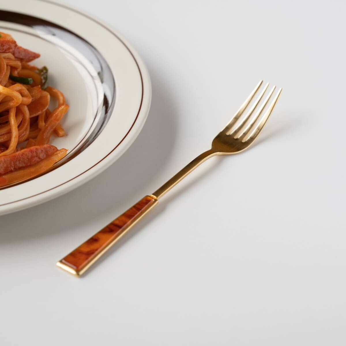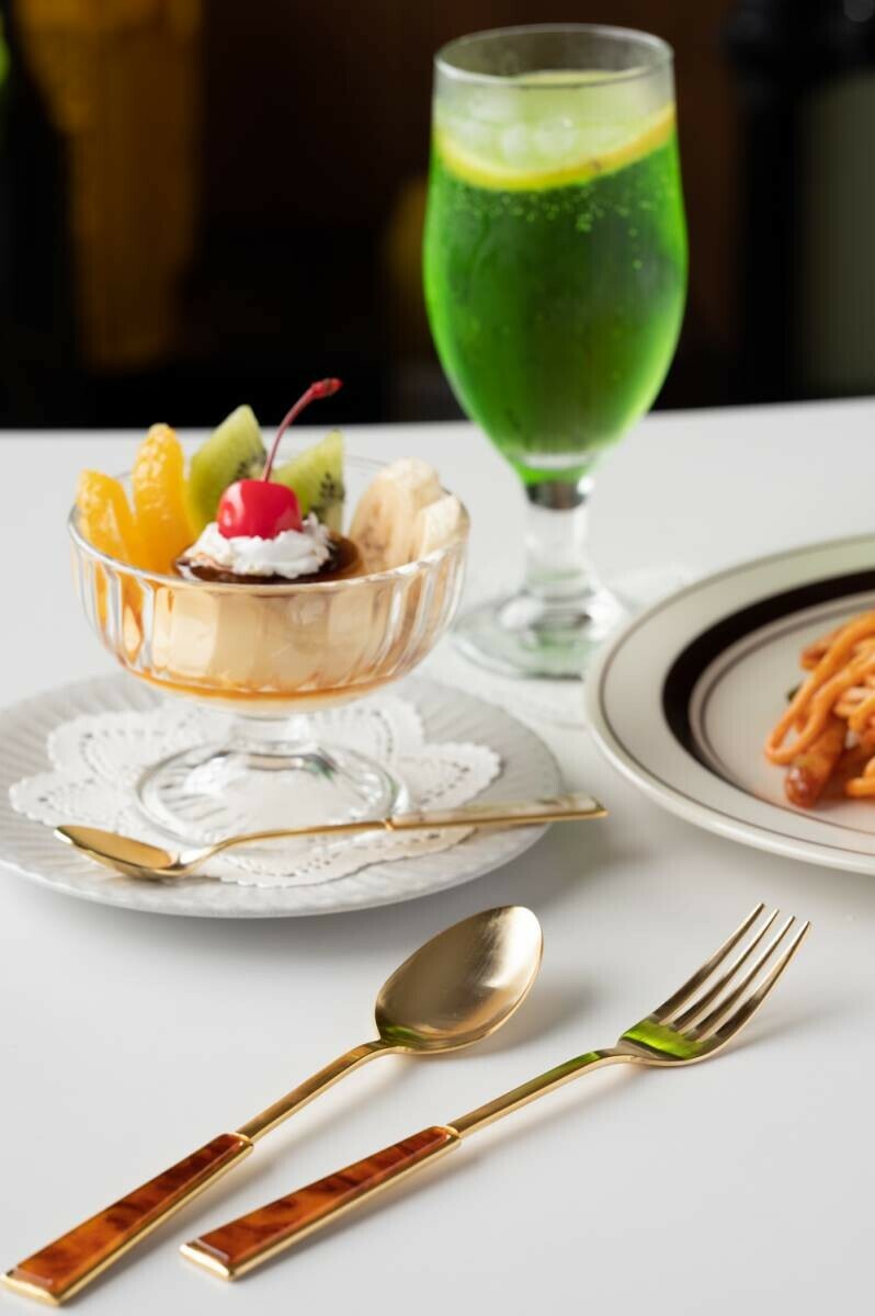 優質的不銹鋼餐具,手柄上有大理石紋的壓克力裝飾,懷舊而新穎的設計,就像昭和時代的咖啡店一樣,會讓你的心激動不已。