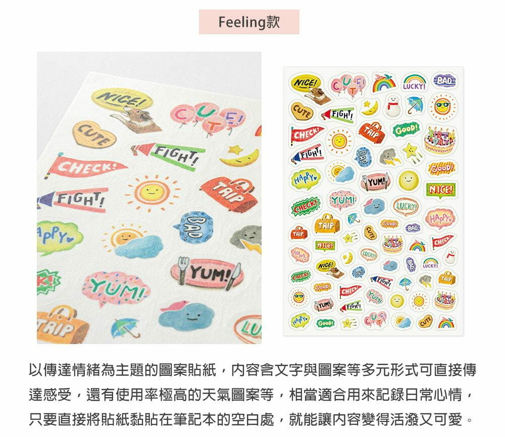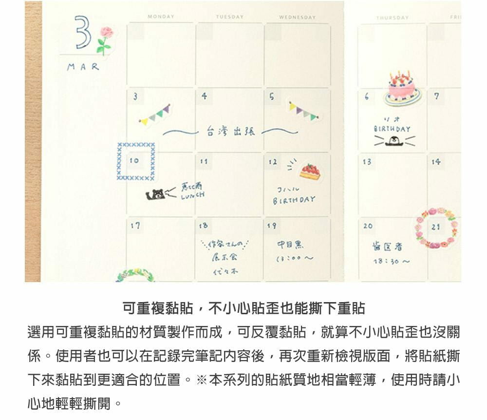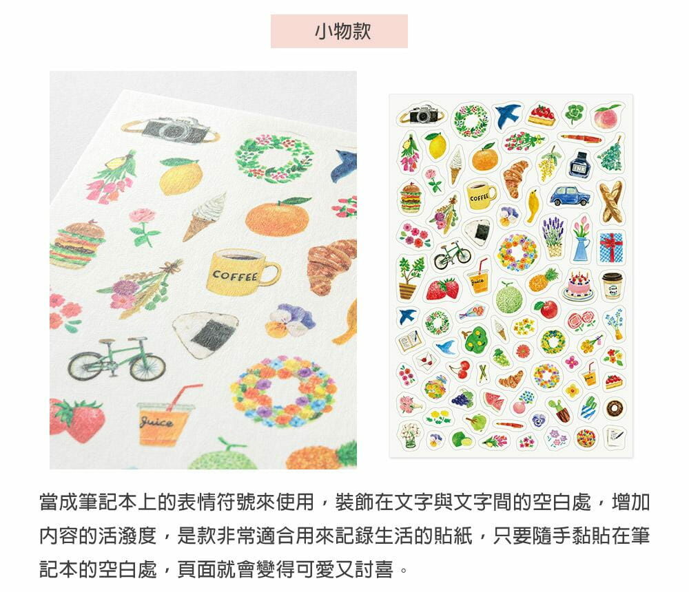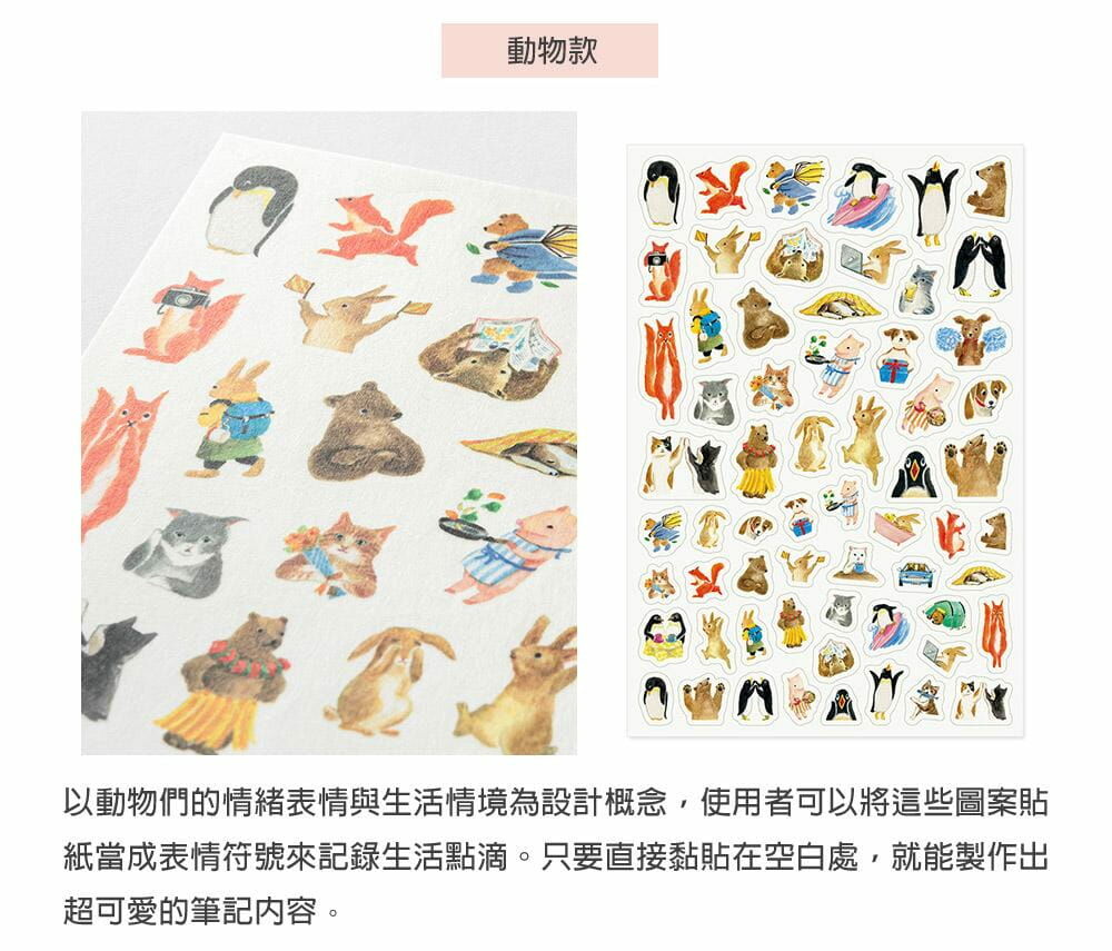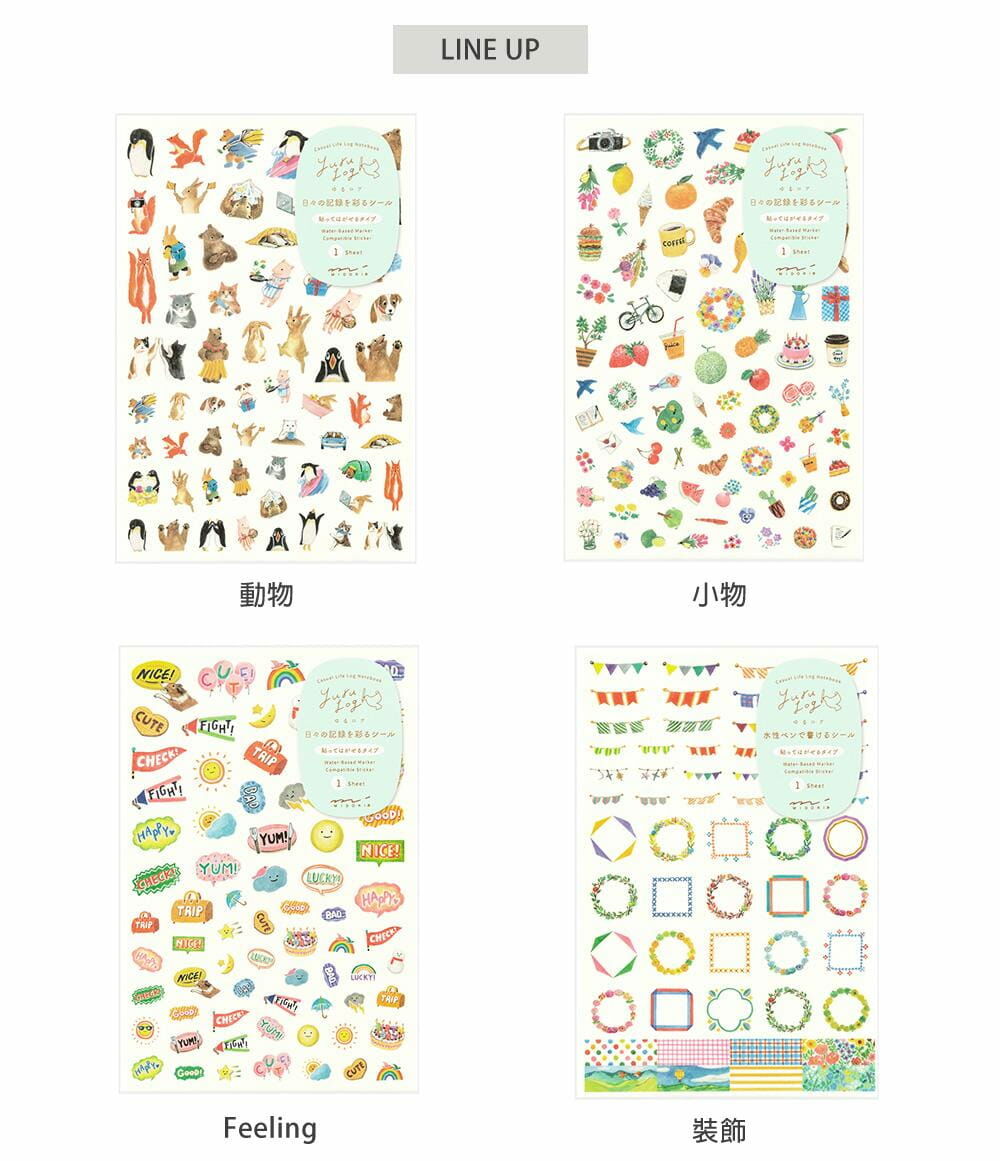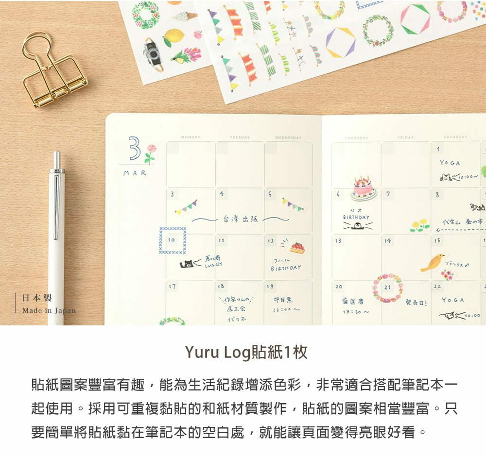 本系列「Yuru Log貼紙」是採用可重複黏貼的和紙材質製作而成,貼紙的圖案相當豐富有趣,能為生活紀錄增添色彩。