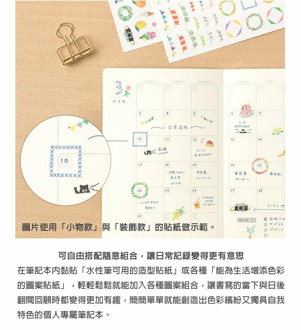 只要簡單將貼紙黏在筆記本的空白處,就能讓頁面變得亮眼好看。