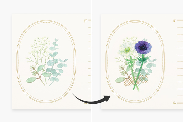 選一張喜愛的花卉貼紙,貼在便箋裡設好的框位,輕鬆完成小小的花束裝飾。