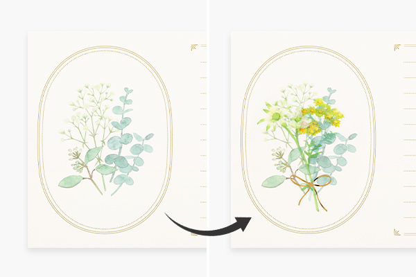 選一張喜愛的花卉貼紙,貼在便箋裡設好的框位,輕鬆完成小小的花束裝飾。