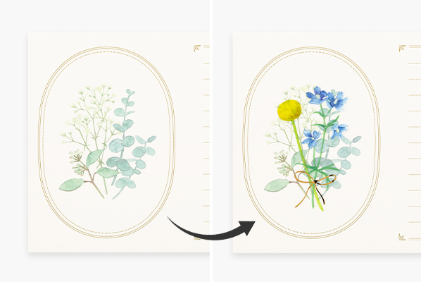 選一張喜愛的花卉貼紙,貼在便箋裡設好的框位,輕鬆完成小小的花束裝飾。