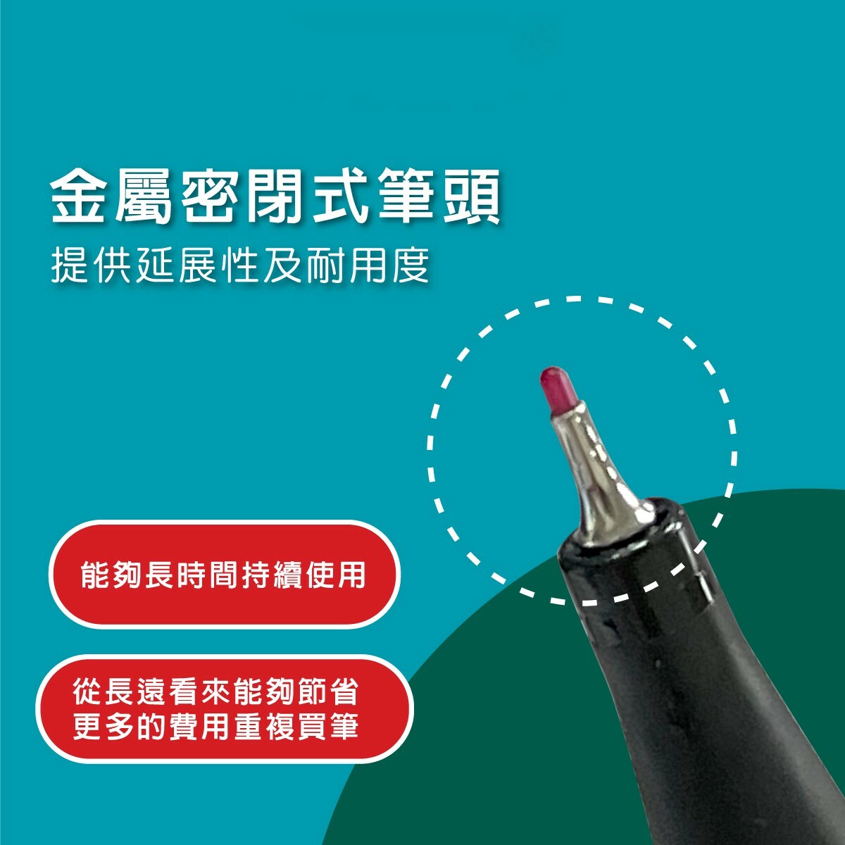 .以特殊工法製造的金屬筆尖堅固耐用,長時間未蓋筆蓋墨水也不易乾枯。
