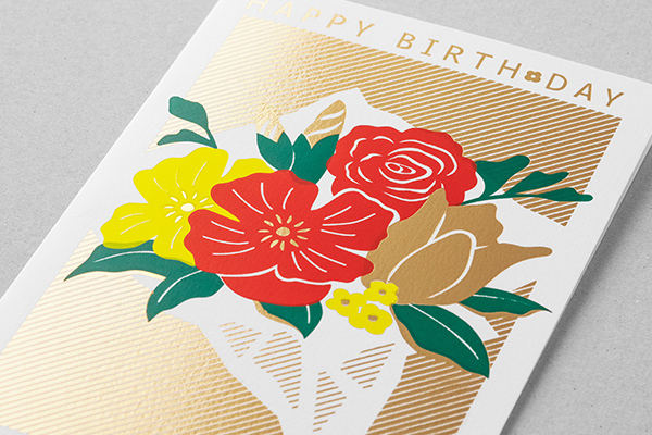 在卡片上,將鮮艷色彩與金屬色澤燙印出文字與圖樣,組合成搶眼的亮麗風格,瞬間吸引眾人目光。
