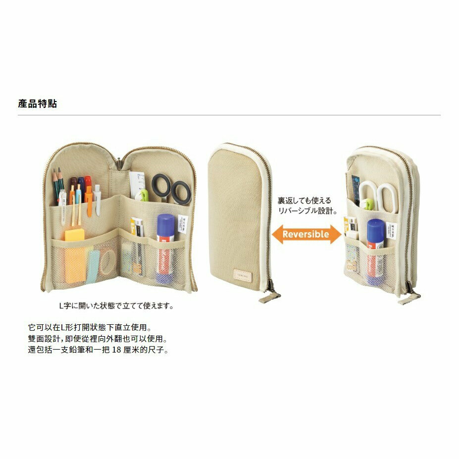 打開呈L型時可直立,內翻時亦可使用,內袋夾層可收納多種文具。