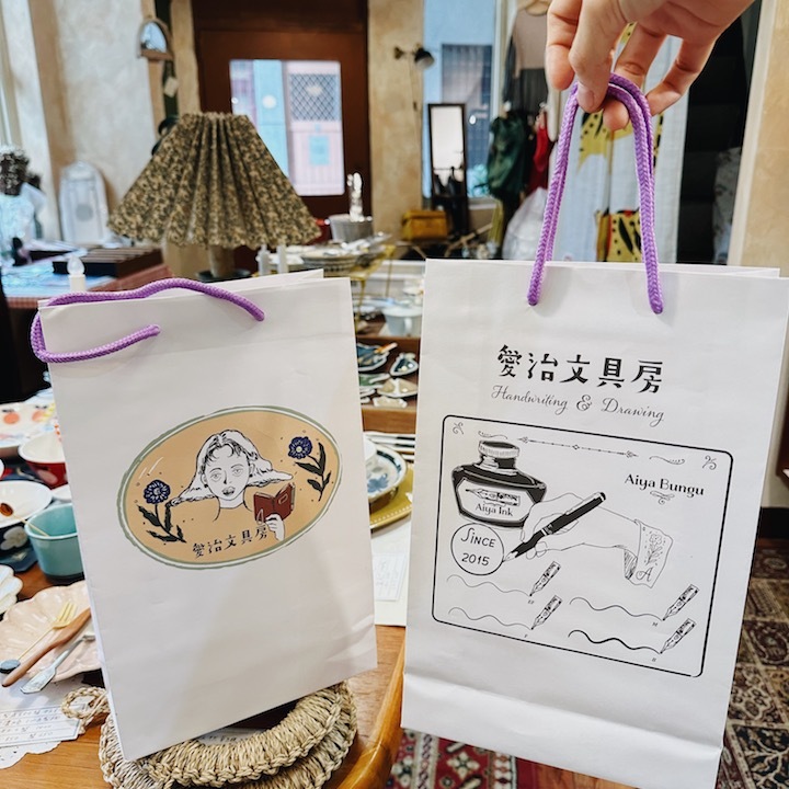 愛治文具房禮品提袋,雙面印刷 正反面都有圖案,搭配粉紫色提繩