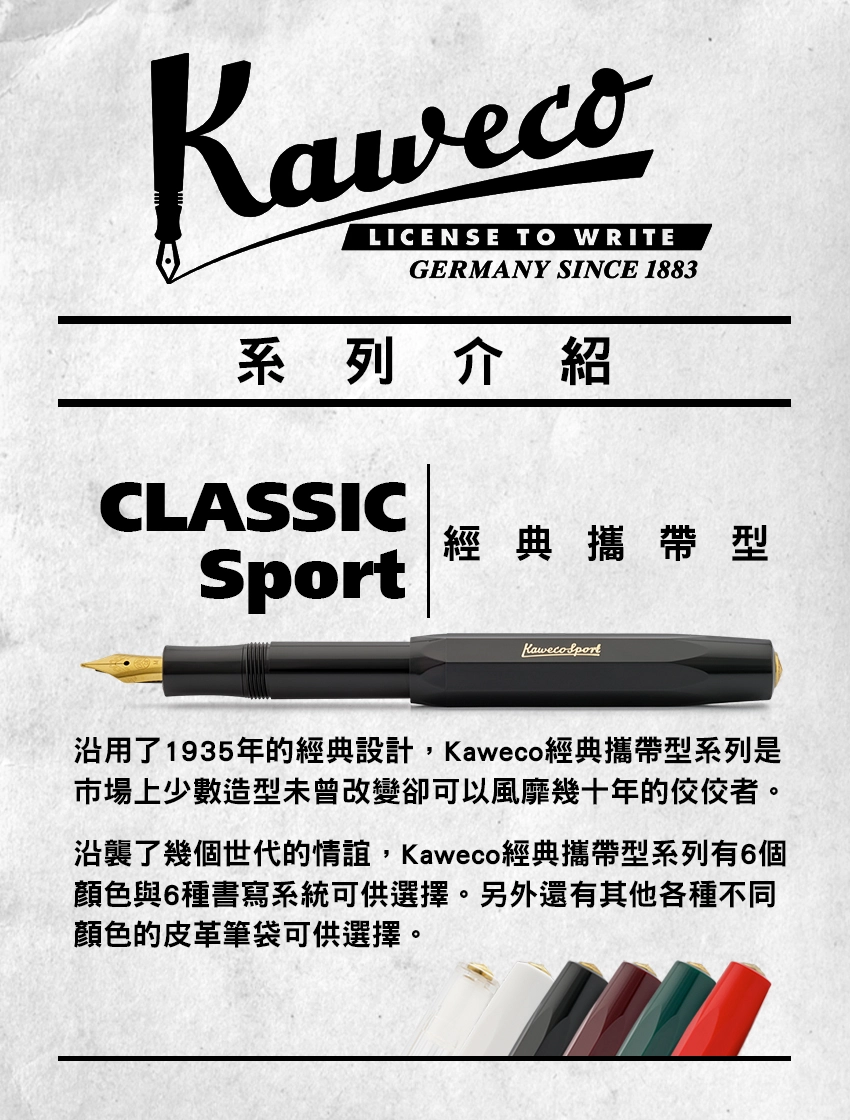 |關於Kaweco|來自德國的頂級製筆品牌,於1883年創立,以開發出第一隻口袋鋼筆而聞名。品牌精神為「體積短小、成就無限」,因此該品牌的書寫工具,無論是鋼筆、原子筆、鋼珠筆或按壓式的素描鉛筆等,都有著八角形的筆管與可放進口袋中的精巧造型,將產品功能極大化,提供豐富多樣、簡約時尚的選擇。