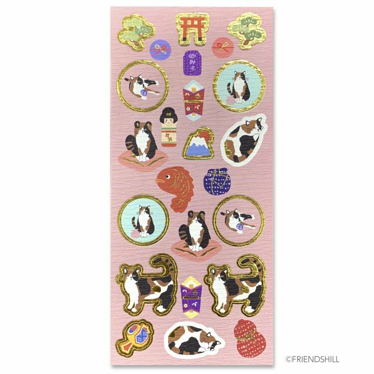 可愛的三花貓,結合了鯛魚和富士山等幸運符的祝賀貼紙。