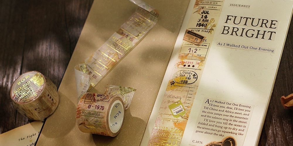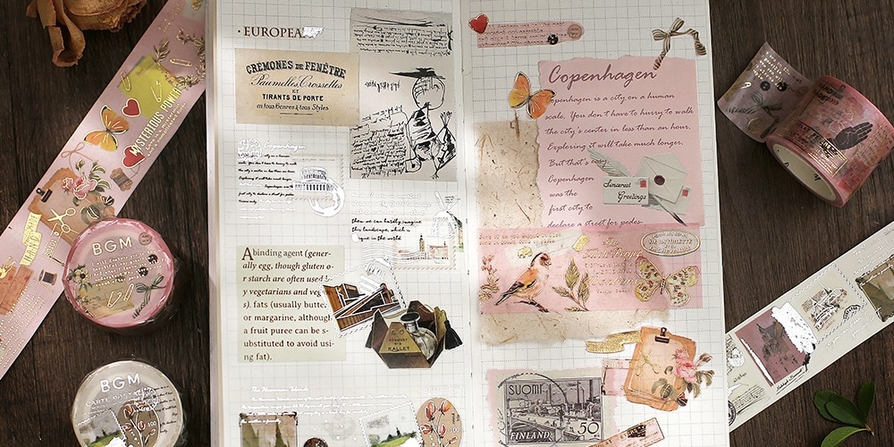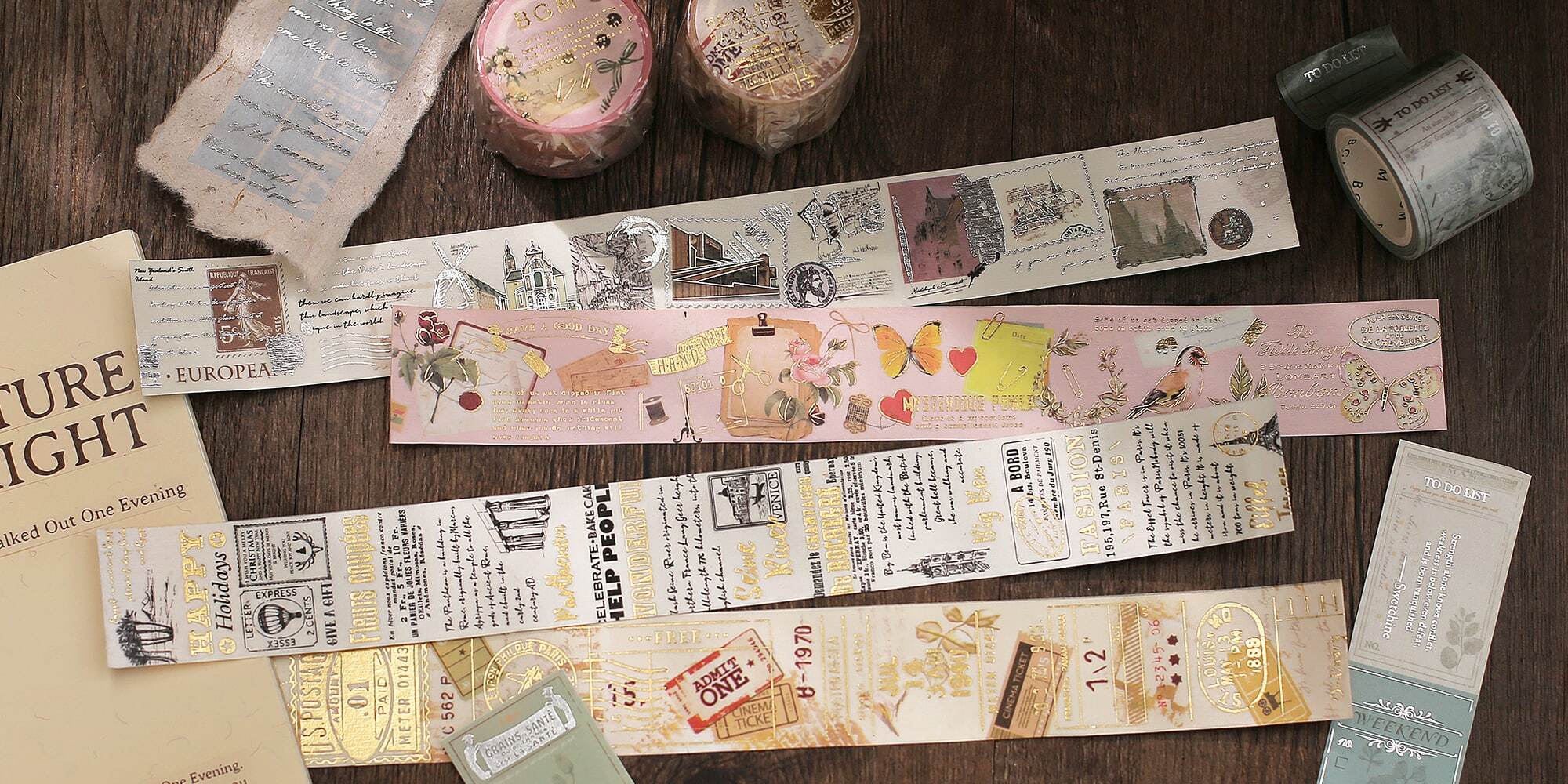 將這些紙膠帶、印章和金箔貼紙集合起來,製作出專屬個人的回憶