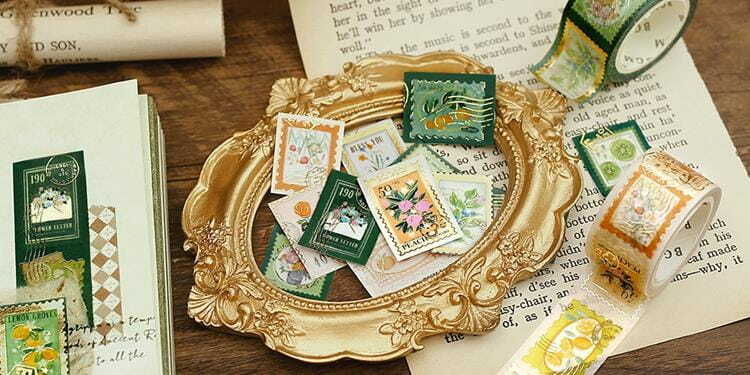 將這些紙膠帶、印章和金箔貼紙集合起來