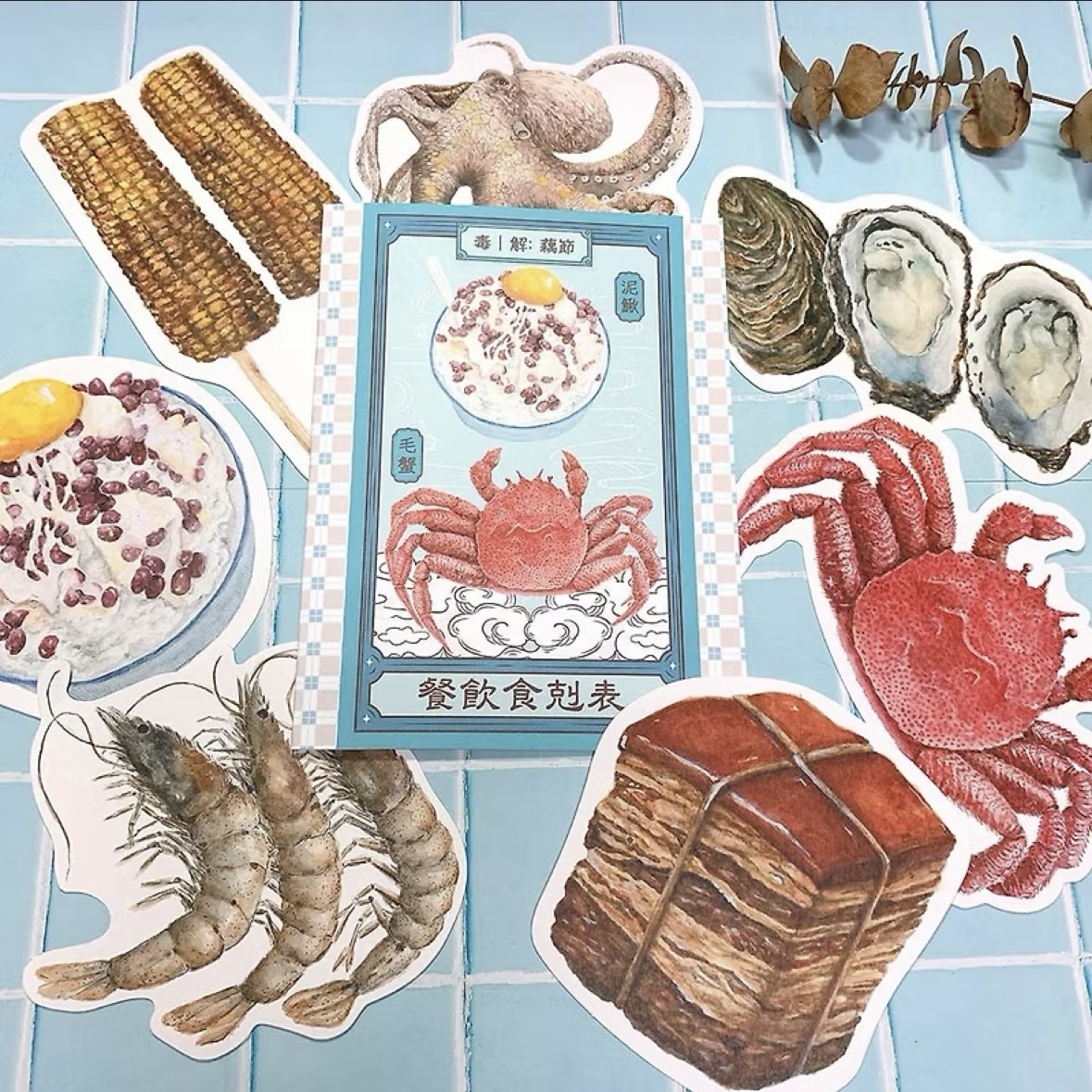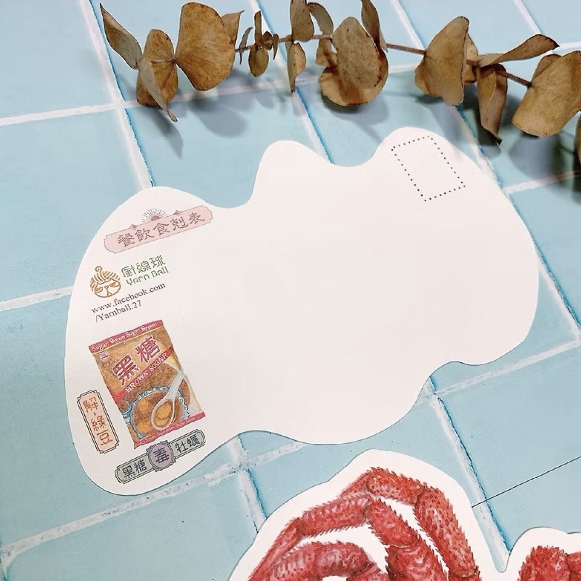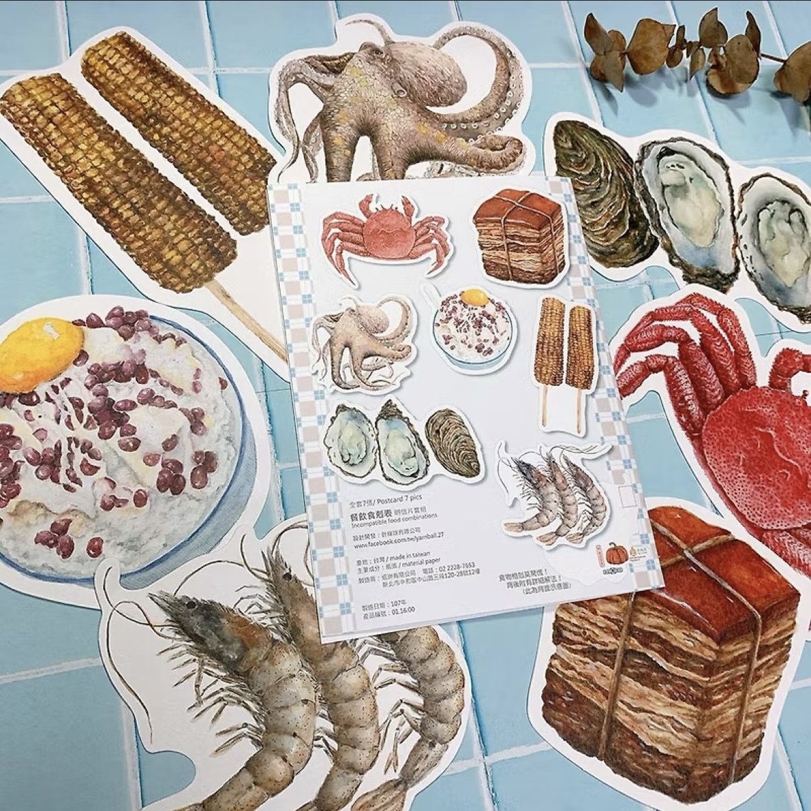 內有:螃蟹、東坡肉、章魚、雞蛋紅豆牛奶冰、烤玉米、生蚵、鮮蝦。