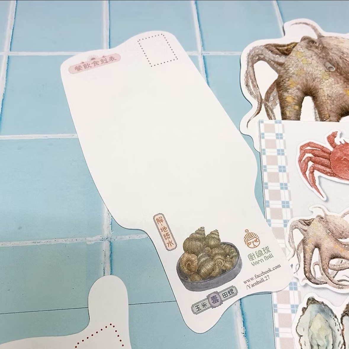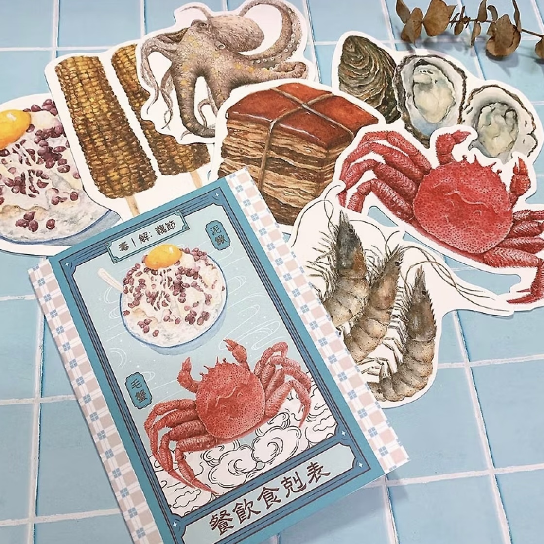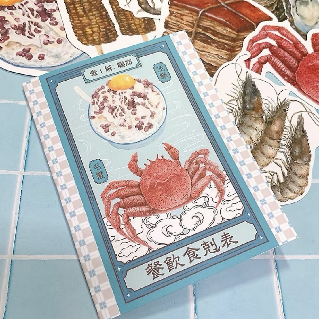 內有:螃蟹、東坡肉、章魚、雞蛋紅豆牛奶冰、烤玉米、生蚵、鮮蝦。