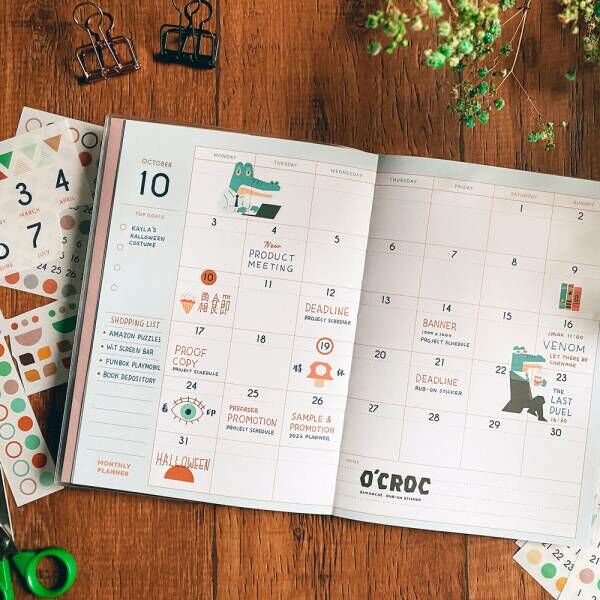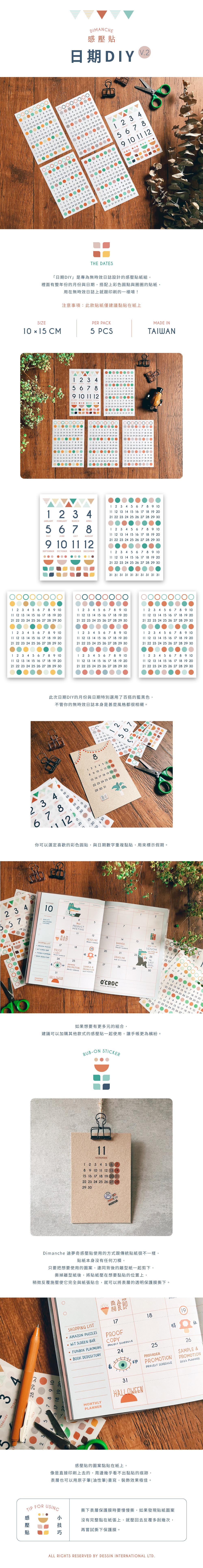 專為無時效日誌設計的感壓貼紙組,裡面有整年份的月份與日期,搭配上彩色圓點與圈圈的貼紙,用在無時效日誌上就跟印刷的一樣唷!