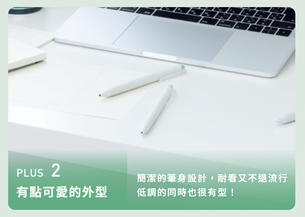 ②時尚簡約的筆桿,採一體成型的設計及霧面玻璃感的筆夾