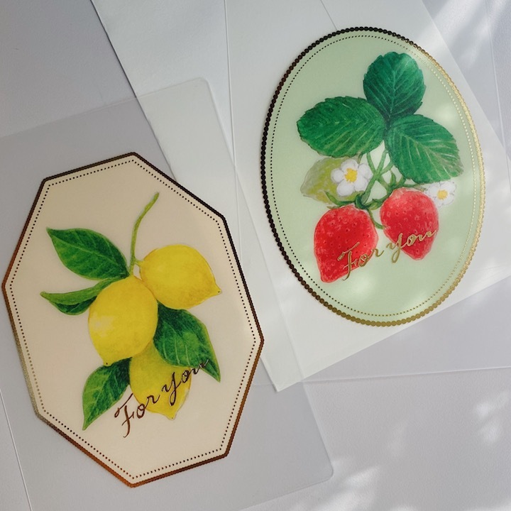 讓人聯想到繪本封面的手繪水彩插圖印在具有磨砂玻璃質感的透明卡片上,並經過燙印框架處理。