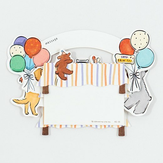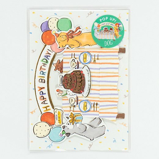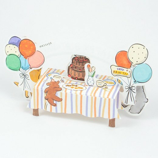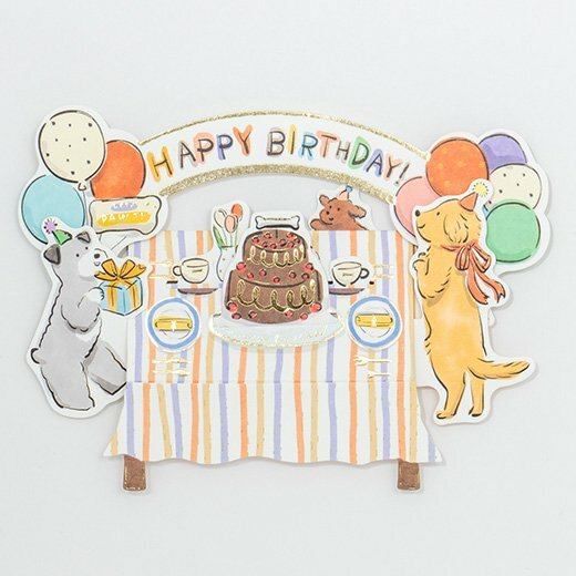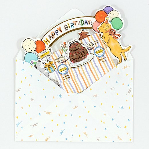 小狗朋友們出現在桌子周圍慶祝他們的生日!這張卡片讓熱鬧的場景像玩具一樣立體。