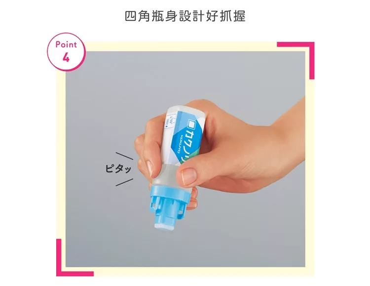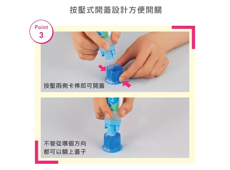方型擦頭可以塗抹紙張邊角~簡易式按壓開關,單手即可開啟