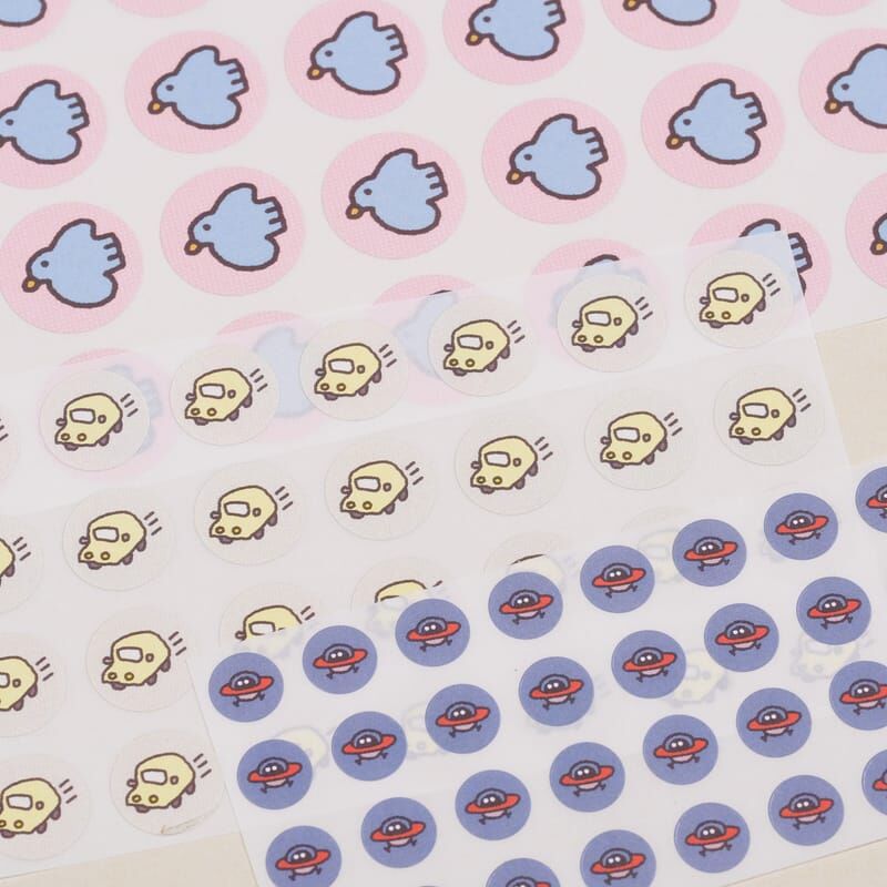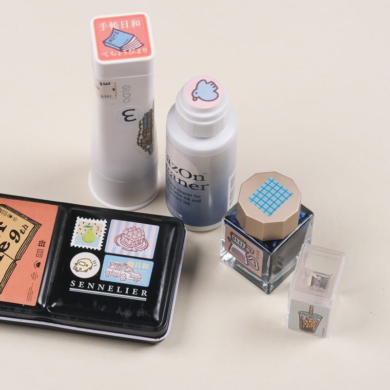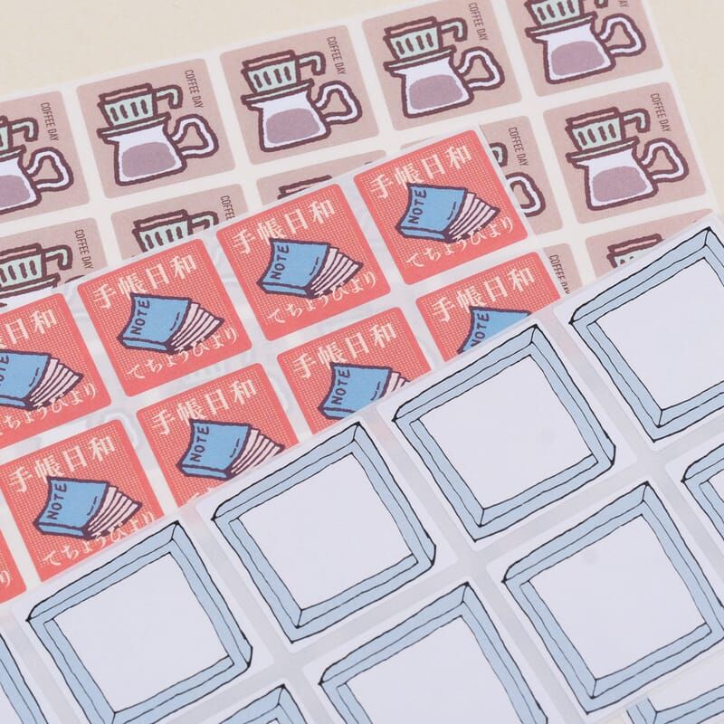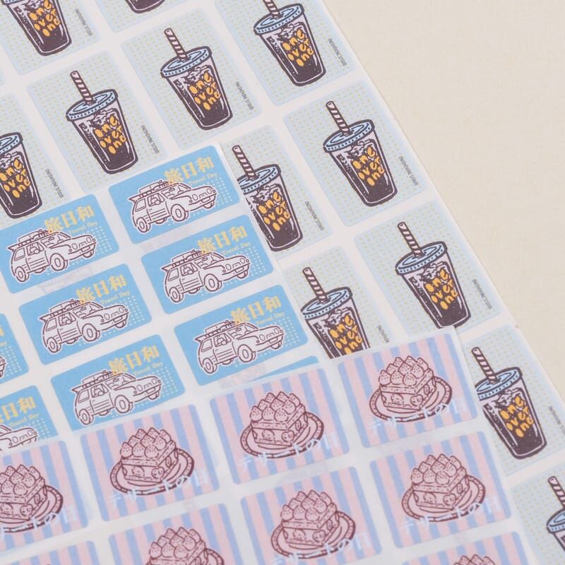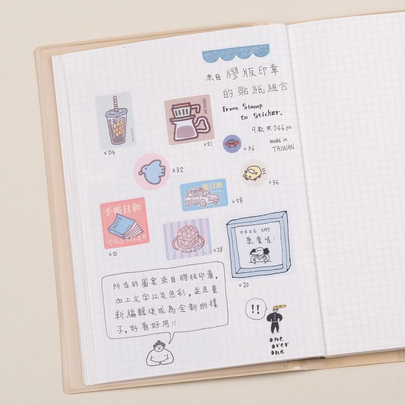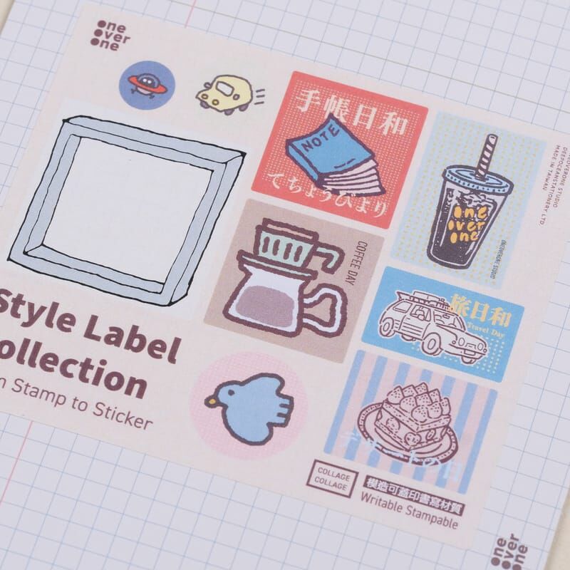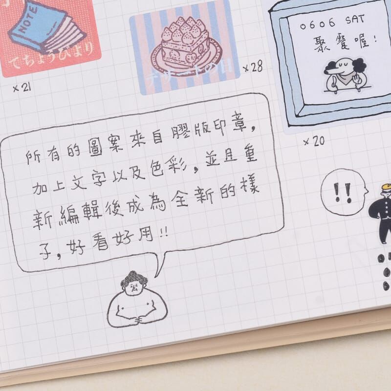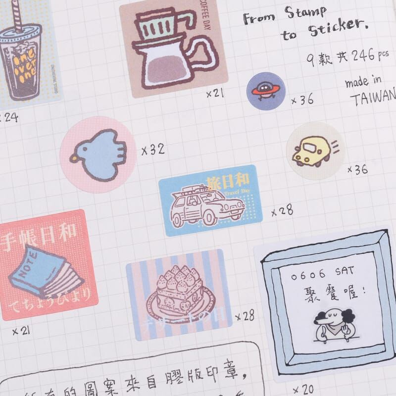 來自膠版印章的圖案,加上文字、顏色之後,重新編輯成不同風格的感覺,適合用來點綴手帳、拼貼、裝飾等,雖然不是防水貼材質,但是模造紙的質感貼在文具上也是滿好看的。