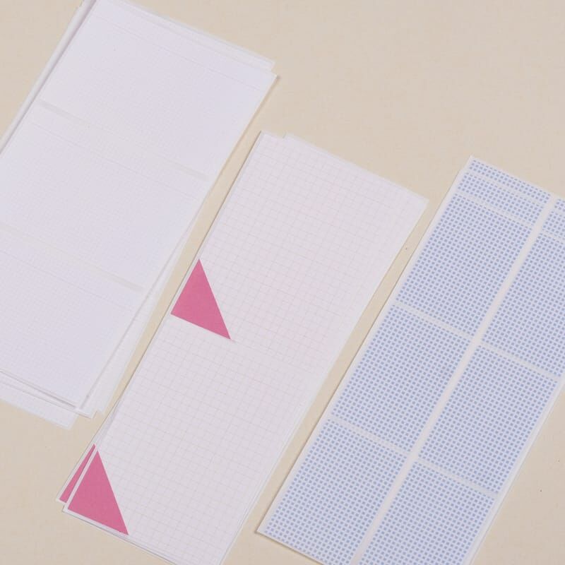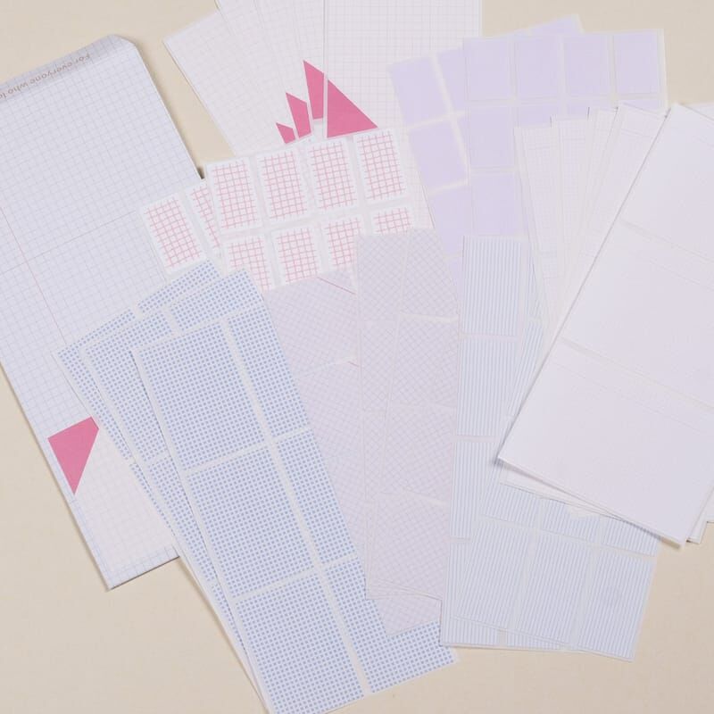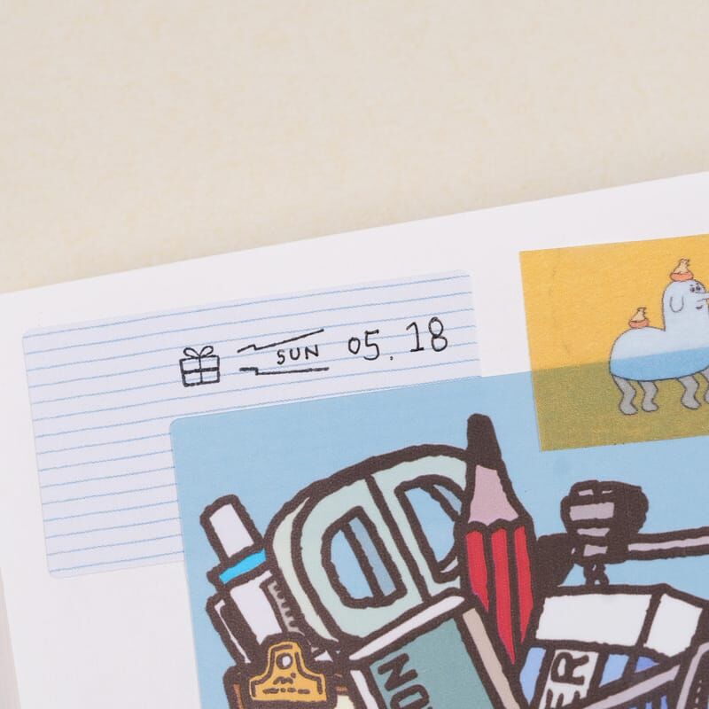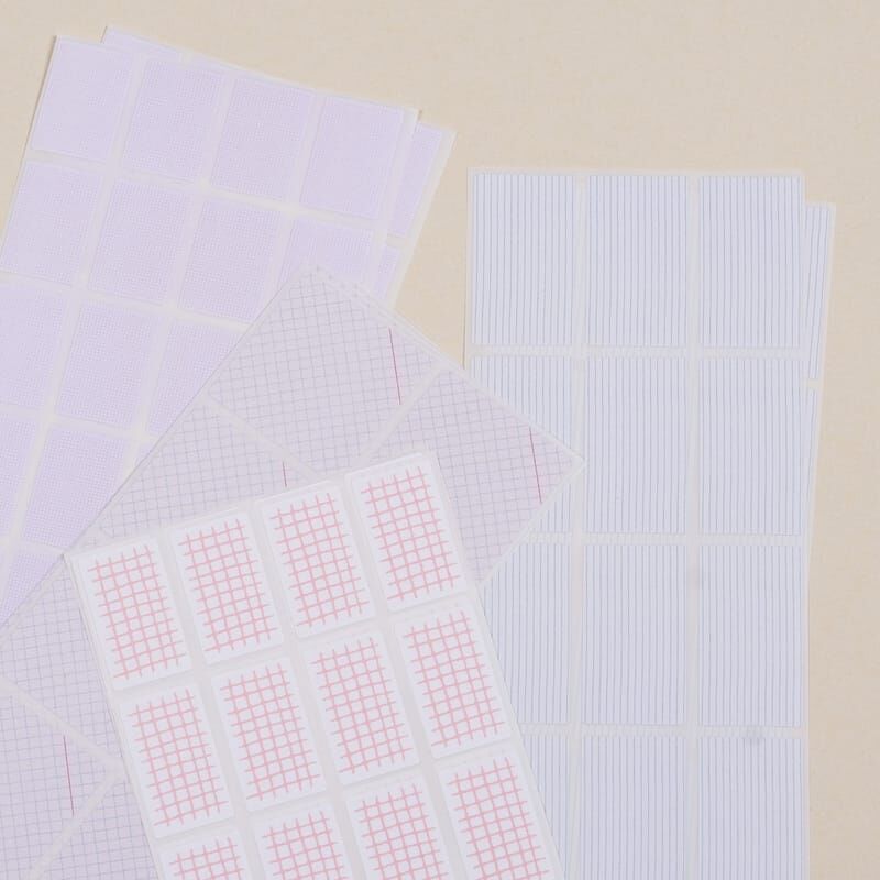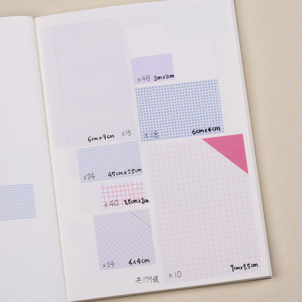 這款貼紙都是以基本格線出發,主要為書寫、標籤、打底用途,尺寸較大的款式也是設計成可以剪開使用的設計,讓使用方式更多元。