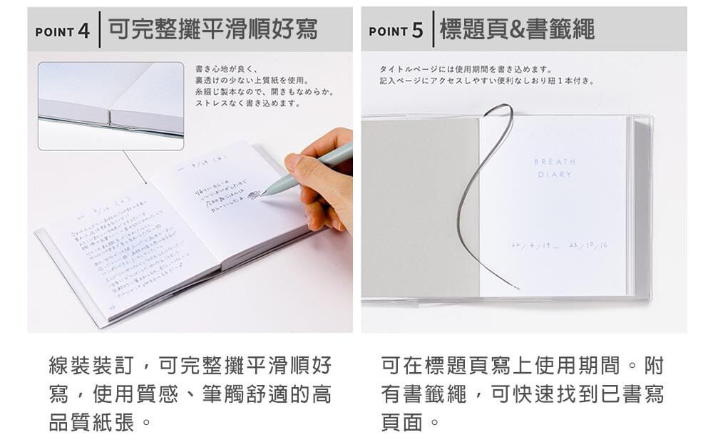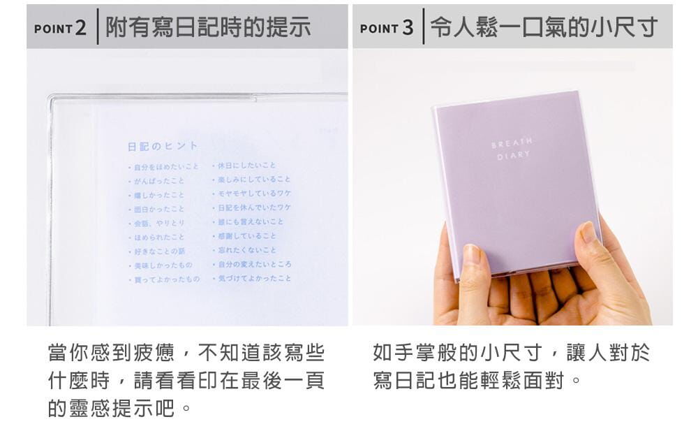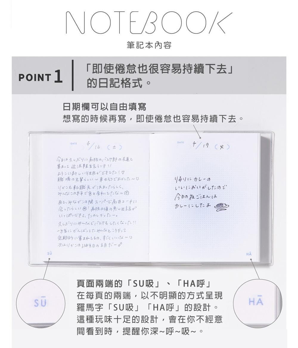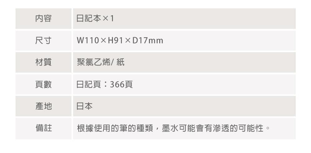 我們特別設計了容易持續寫下去的格式,以及容易拿取的設計,並且注重易於書寫的規格。這是一本日期自由填寫、只有手掌大小的366頁日記。