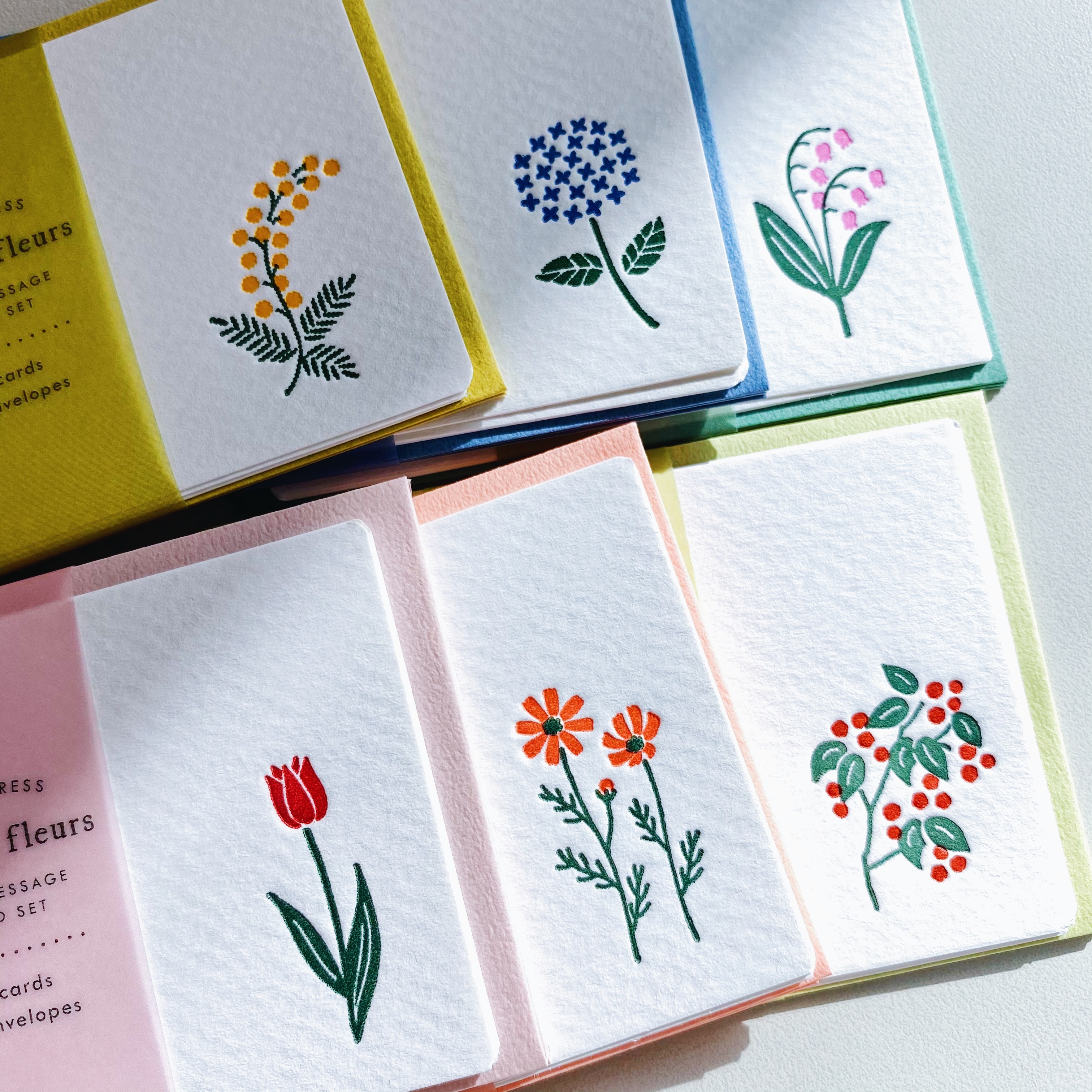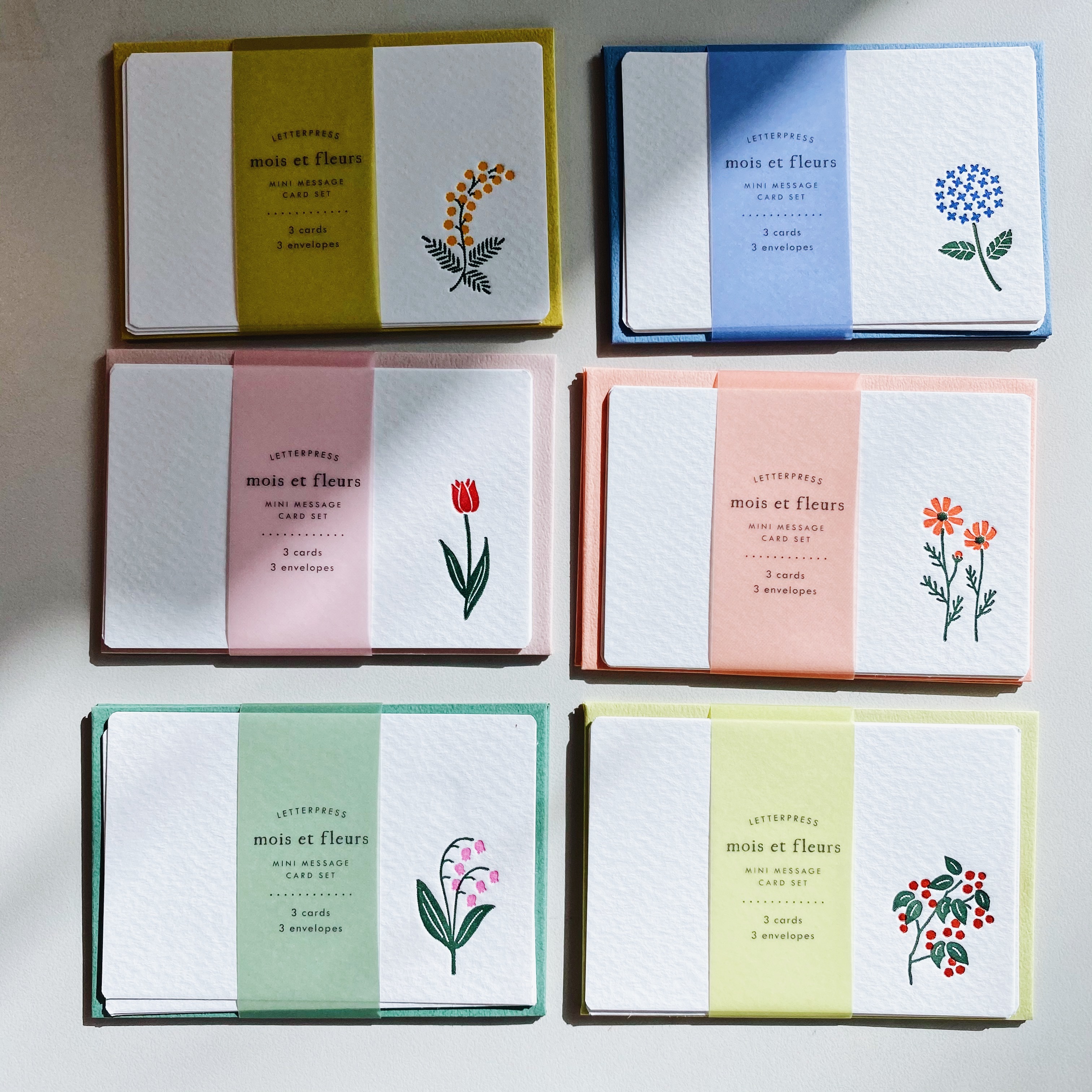 法語 mois et fleurs 意思是月與花朵,將每個月份所對應的季節之花,利用活板印刷,壓印在卡片上,呈現了質感的凹凸感。