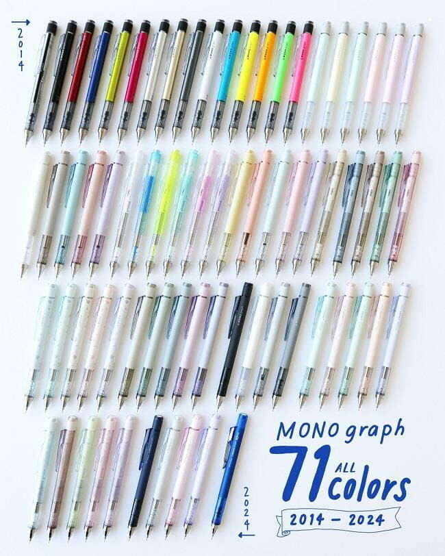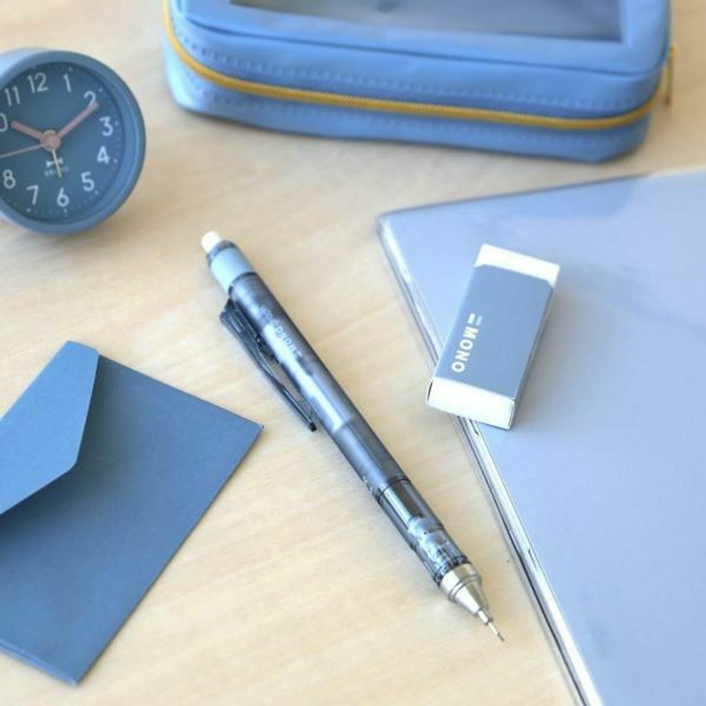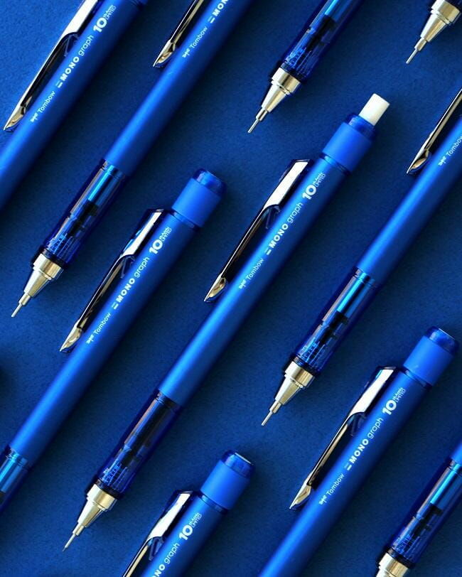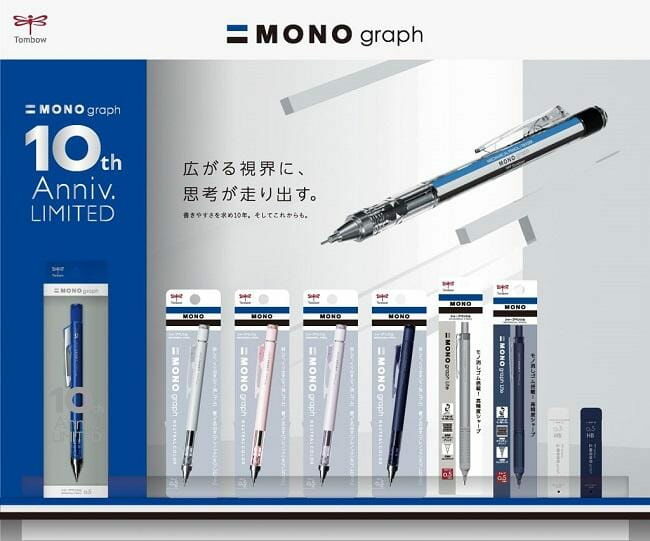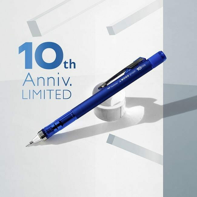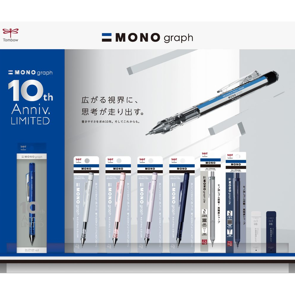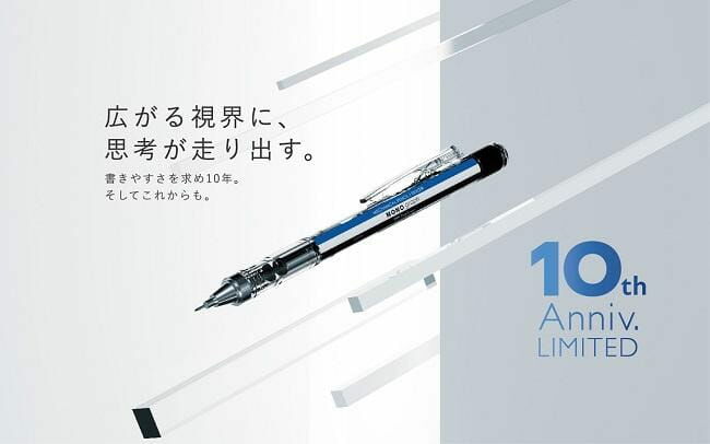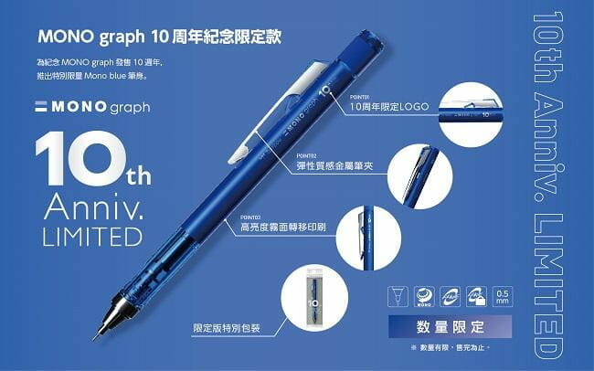 筆身末端刻有「MONO graph 10th Anniv. LIMITED」,這是十週年紀念版的專屬標誌。金屬夾設計使筆握感堅固,銀色點綴與純藍色機身相互呼應,增添了吸引力。