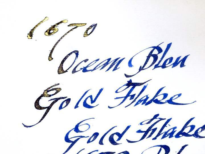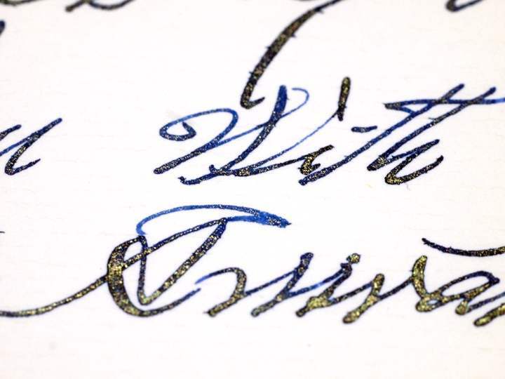 此系列墨水帶金粉,粉質細緻,可以用於鋼筆書寫,在出墨量大時亮粉能夠有優異的表現。