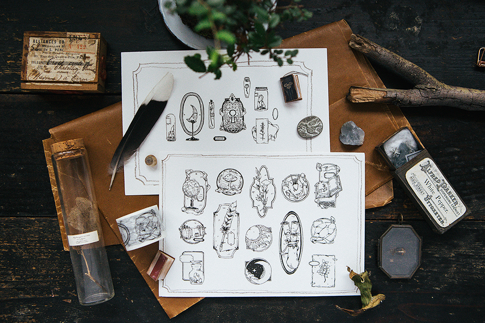 地球儀和羊皮紙捲軸,把這些博物館室長的裝備和收藏,用黑白表現在紙張上。