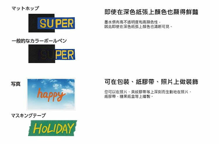 色彩濃郁豔麗,遮蓋力強,寫手帳或繪圖皆可使用