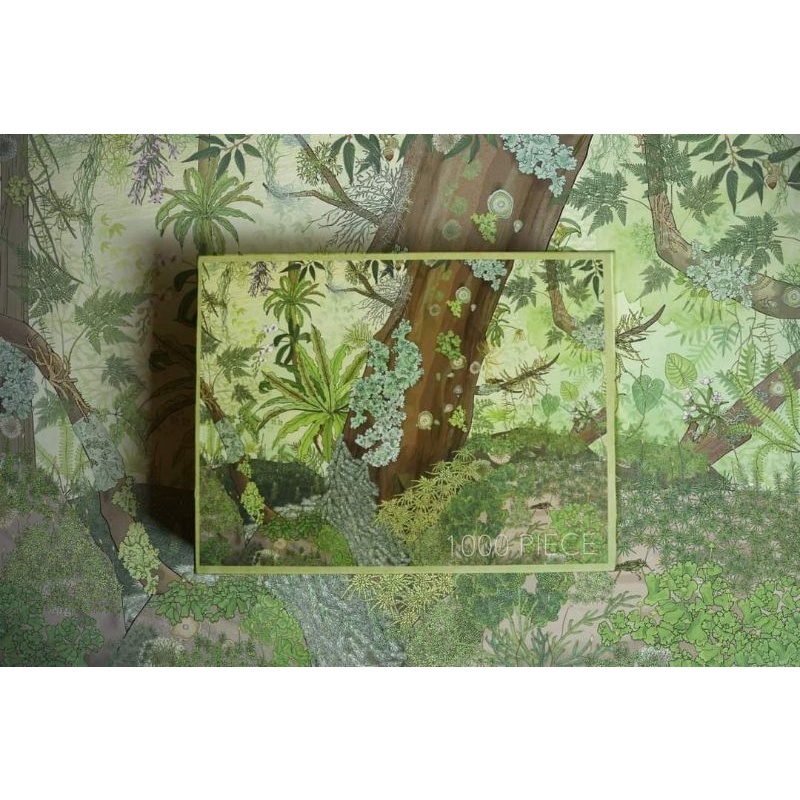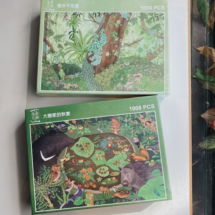 林務局推出的「大樹家的秋宴」、「微非不足道」兩款拼圖,延續2021年生命之森月曆,以臺灣原生種之間有趣的關係為構圖,像是附著在岩石的苔蘚、嵌在樹身上的蘭花,以及隱身在苔蘚上的蓬萊棘露螽,還有喜愛殼斗的熊族、野豬、松鴉與松鼠等等,具挑戰性又饒富趣味,讓大家邊拼還能從拼圖中認識臺灣原生的動物與植物!