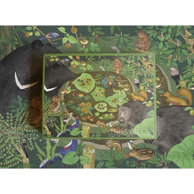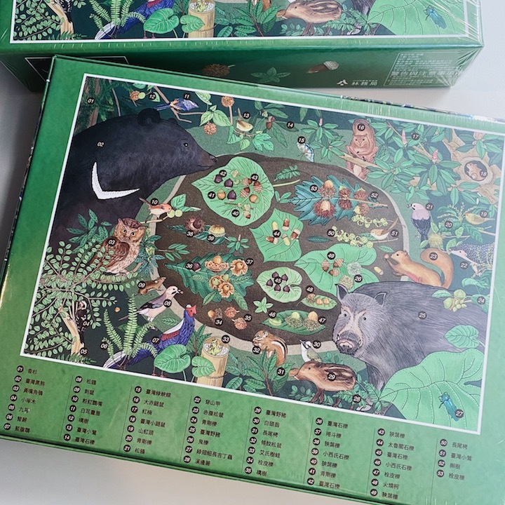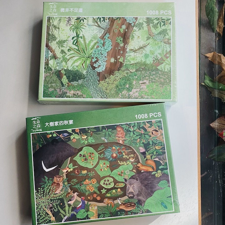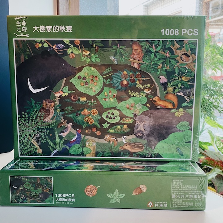 林務局推出的「大樹家的秋宴」、「微非不足道」兩款拼圖,延續2021年生命之森月曆,以臺灣原生種之間有趣的關係為構圖,像是附著在岩石的苔蘚、嵌在樹身上的蘭花,以及隱身在苔蘚上的蓬萊棘露螽,還有喜愛殼斗的熊族、野豬、松鴉與松鼠等等,具挑戰性又饒富趣味,讓大家邊拼還能從拼圖中認識臺灣原生的動物與植物!