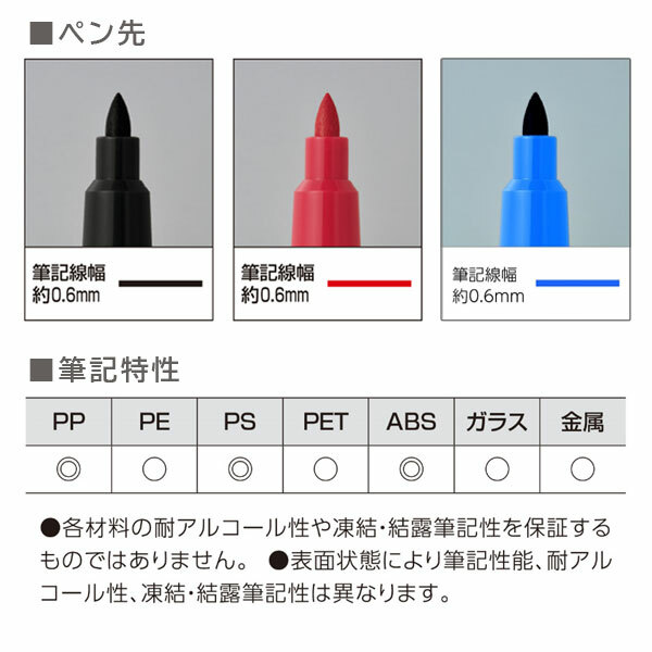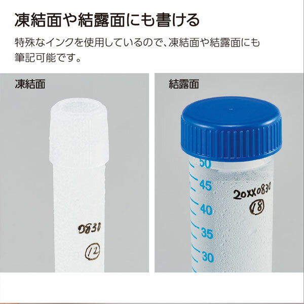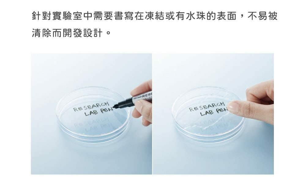 針對實驗室中需要書寫在凍結的表面或有水珠的表面,並且不易被清除而開發設計的油性簽字筆。