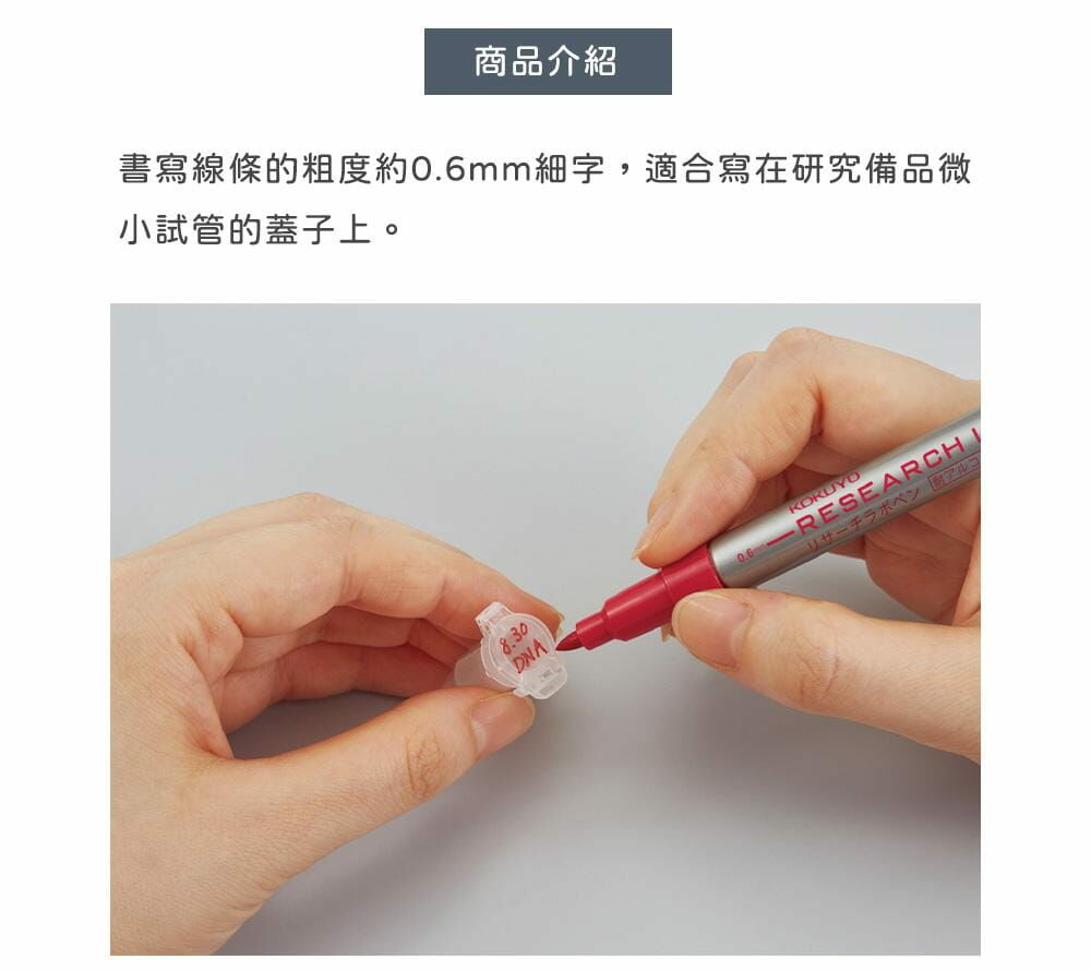 書寫線條的粗度約0.6mm細字,適合寫在研究備品微小試管的蓋子上。