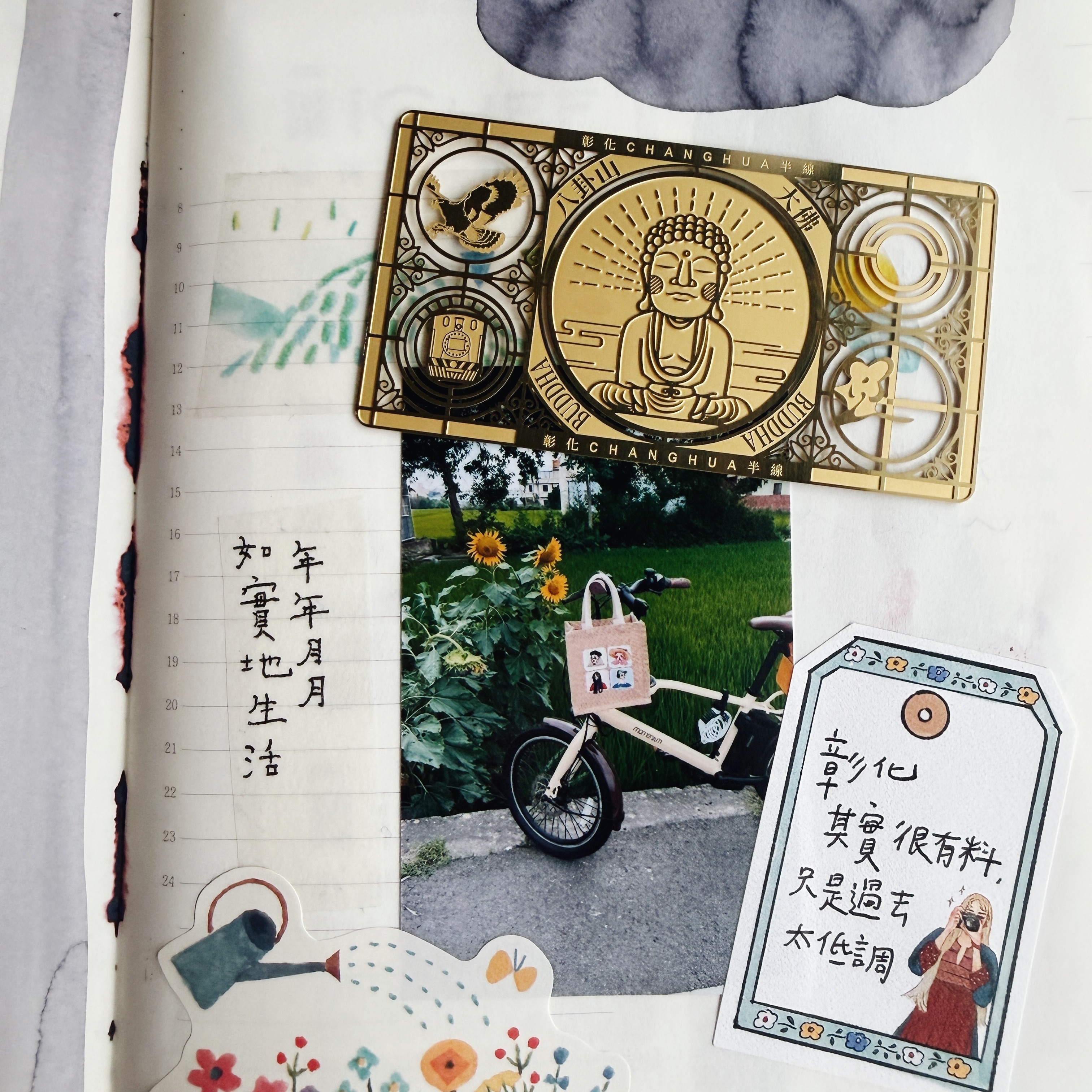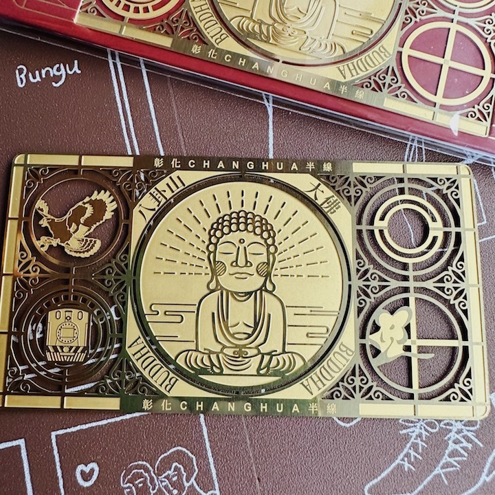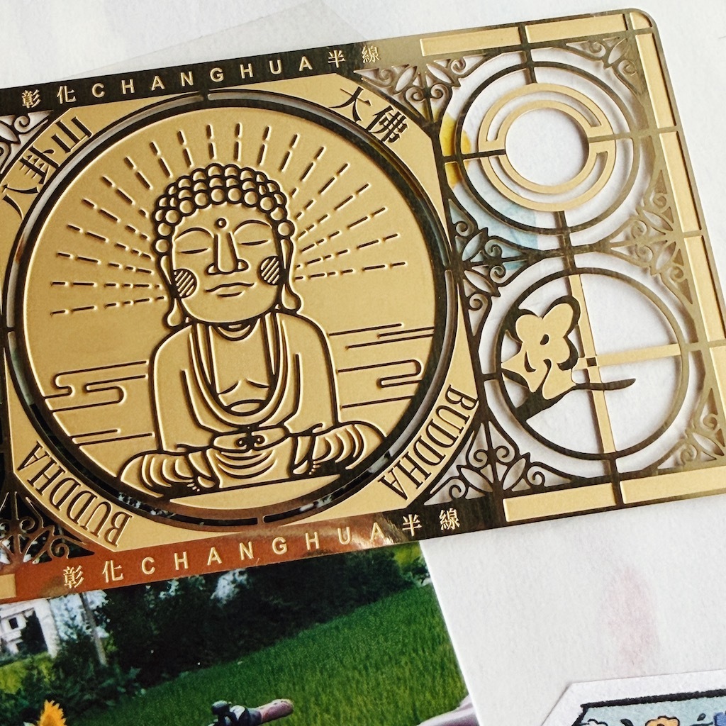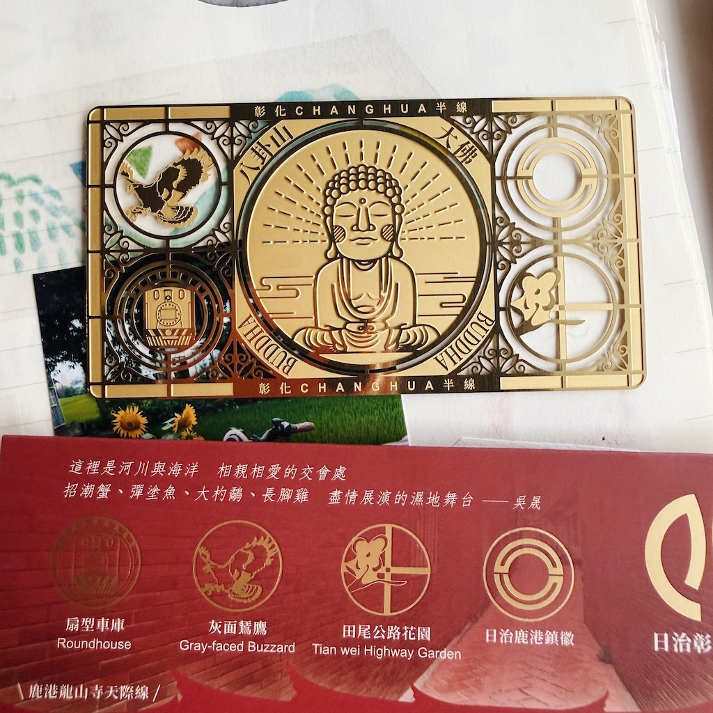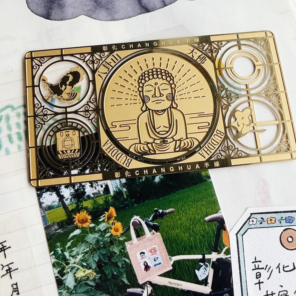 以八卦山大佛為主,配上日治鹿港鎮徽、田尾公路花園、八卦山國慶鳥_灰面鵟鷹、扇形車庫的圖案