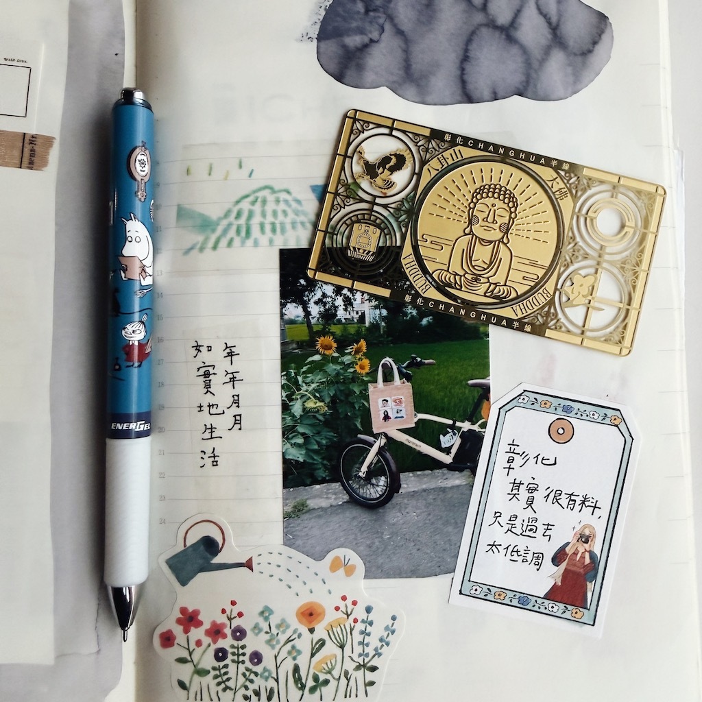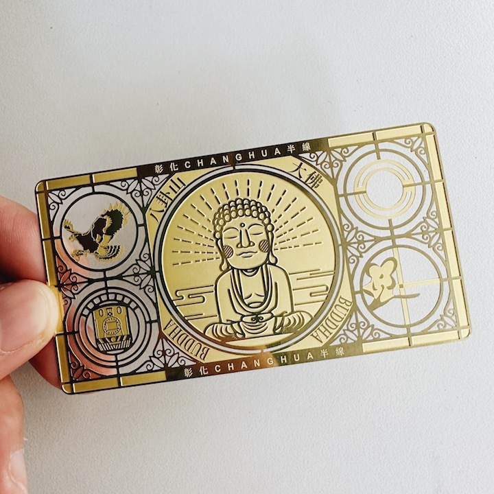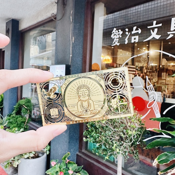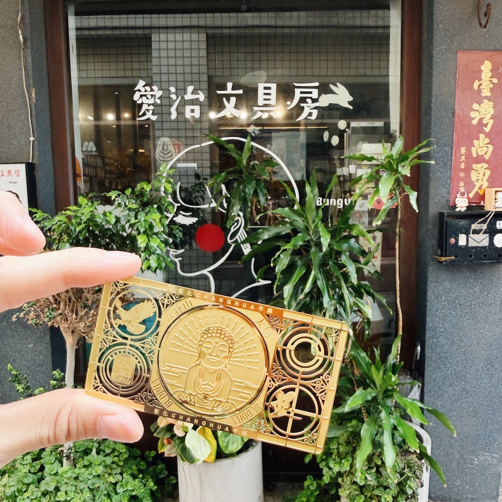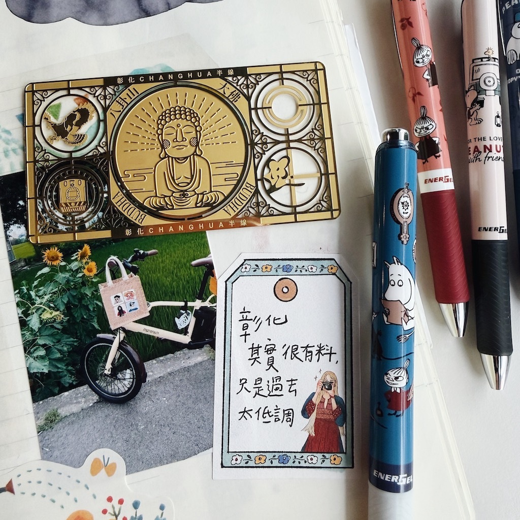 以八卦山大佛為主,配上日治鹿港鎮徽、田尾公路花園、八卦山國慶鳥_灰面鵟鷹、扇形車庫的圖案