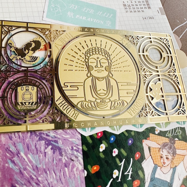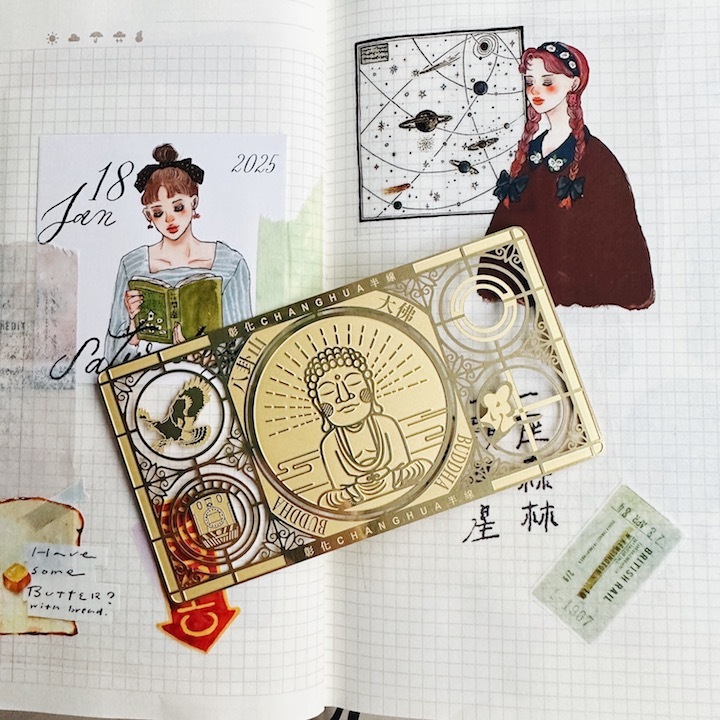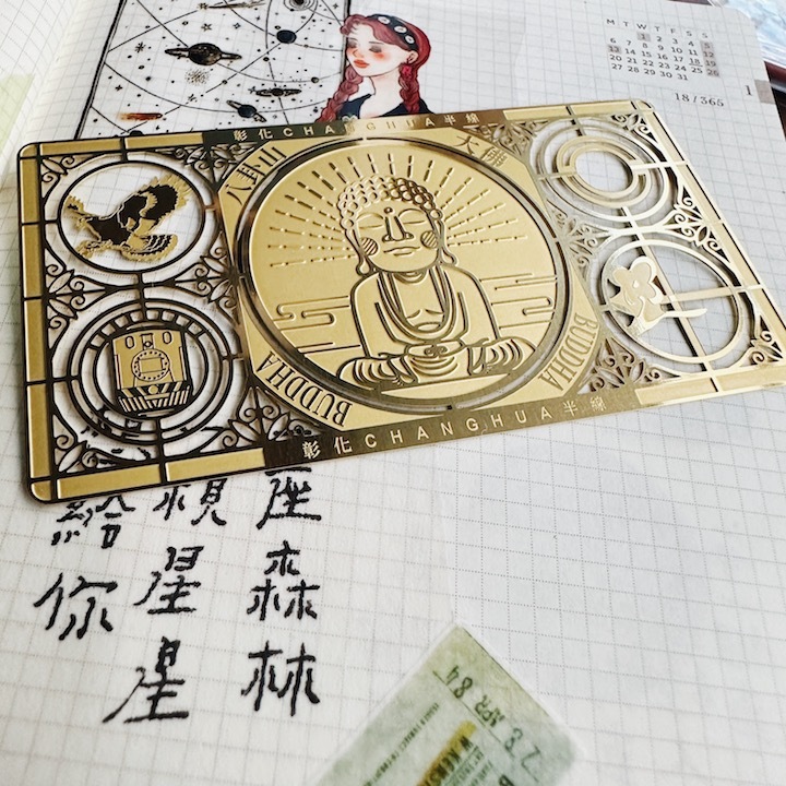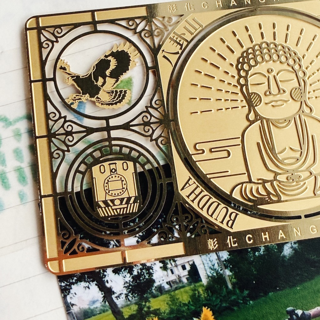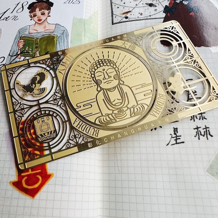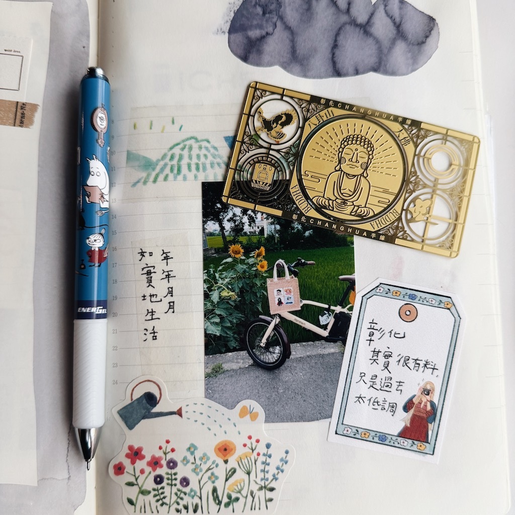 以八卦山大佛為主,配上日治鹿港鎮徽、田尾公路花園、八卦山國慶鳥_灰面鵟鷹、扇形車庫的圖案