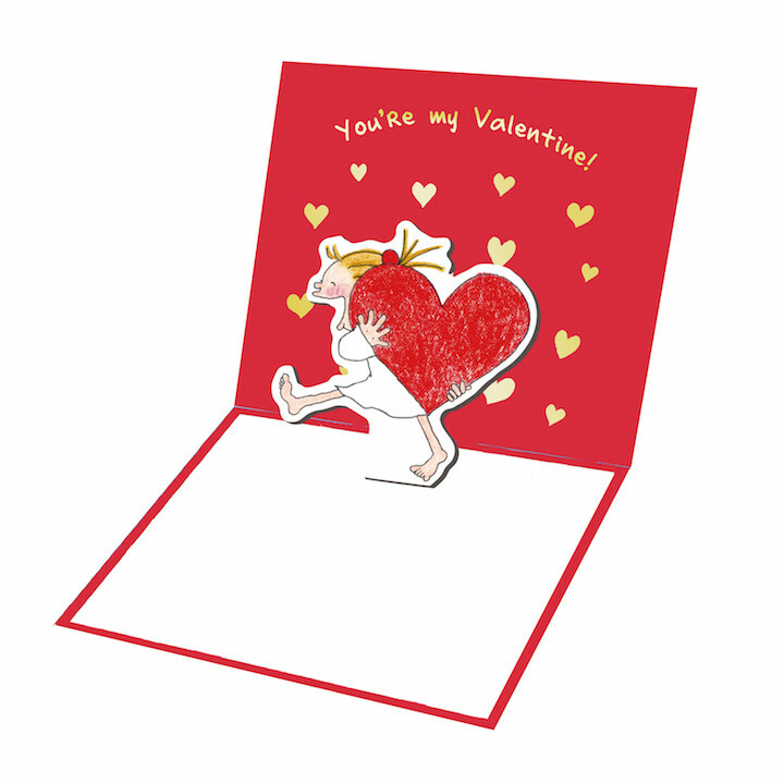 一張有趣的情人節賀卡,當你打開折疊的卡片時會彈出捧著愛心的小女孩