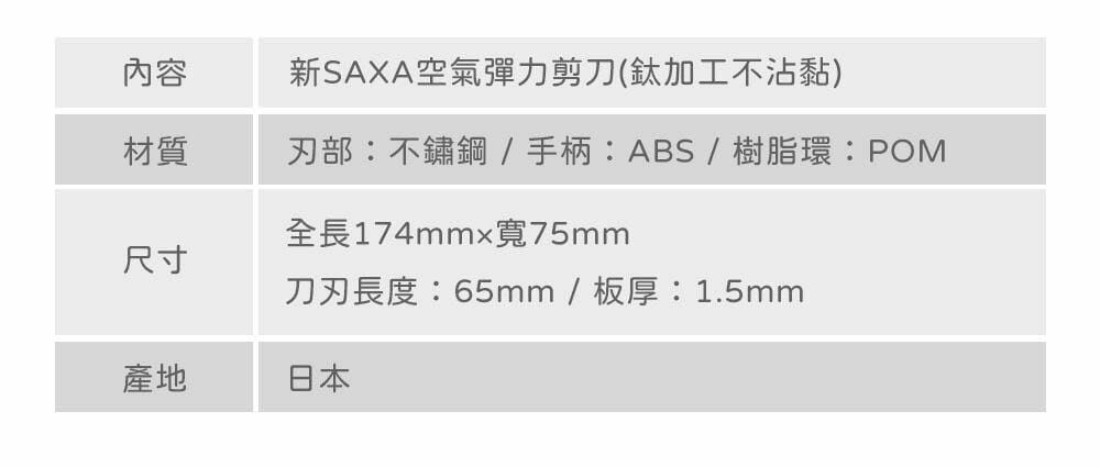 材質 / 刃部: 不鏽鋼; 手柄: ABS丙烯腈-丁二烯-苯乙烯; 樹脂環: POM聚甲