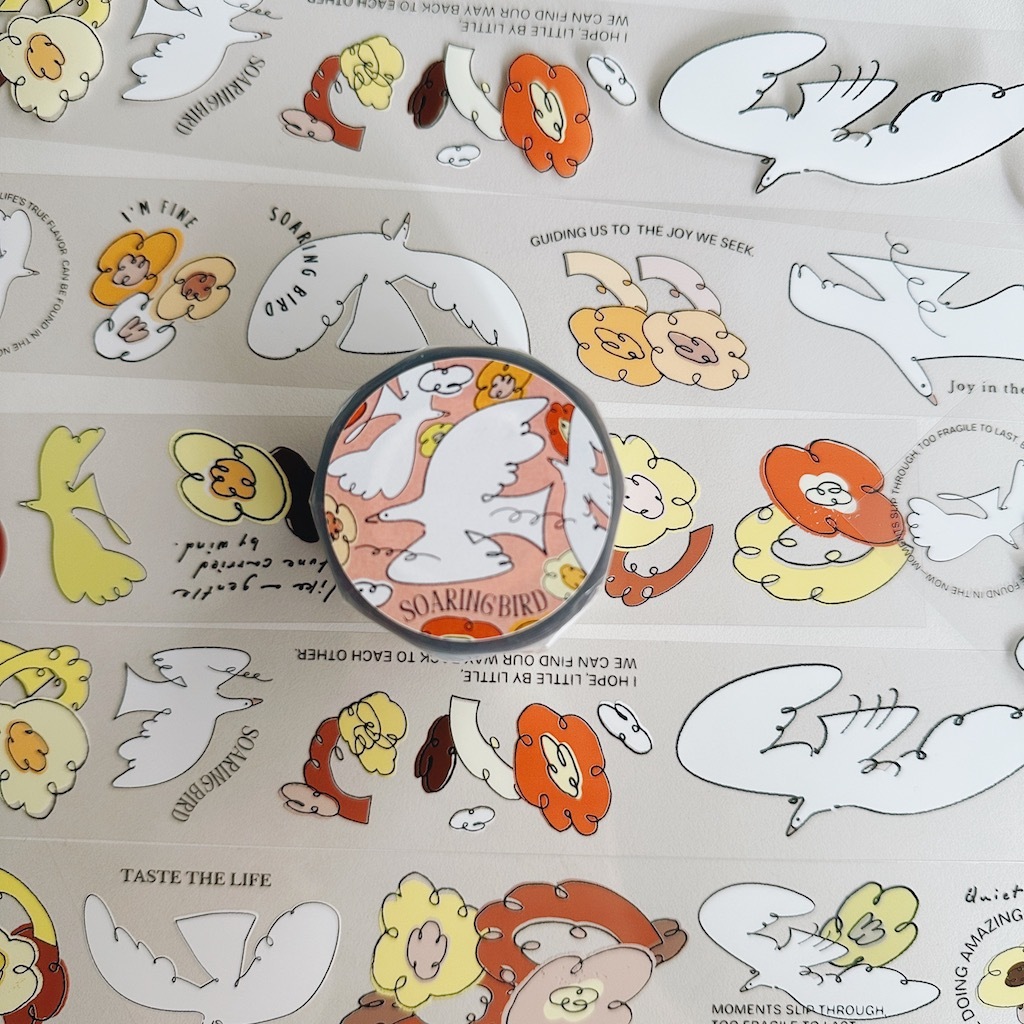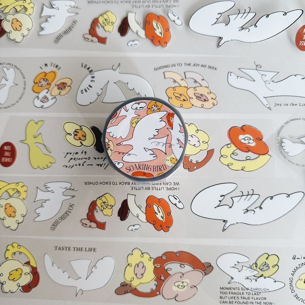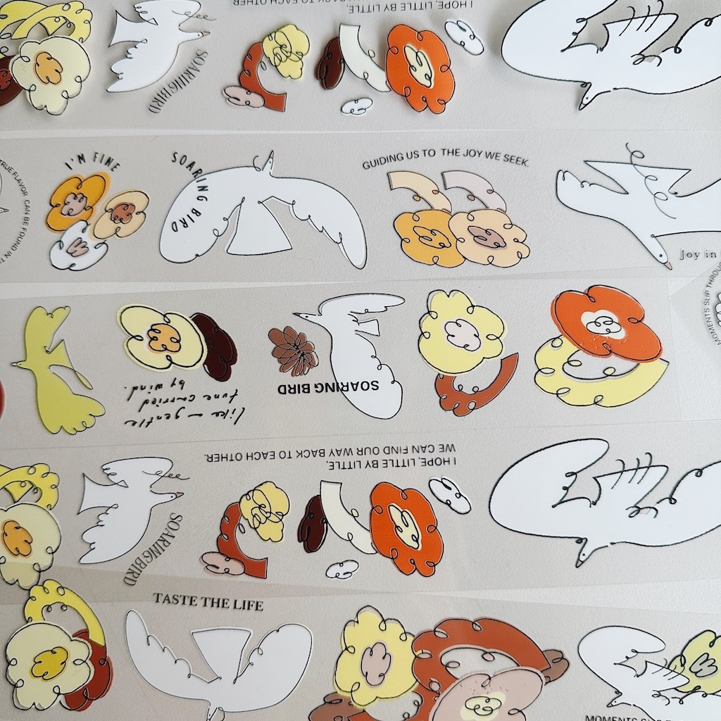 從刺繡開始發展的飛鳥,如針線一般流暢自由,捲起來的羽毛好可愛~花朵也變得像線團一樣,柔軟但頗有能量!