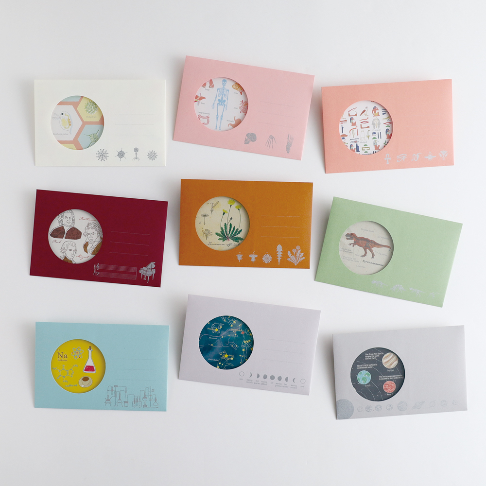 燙金信封上有圓形透明框,可以顯示出科學主題