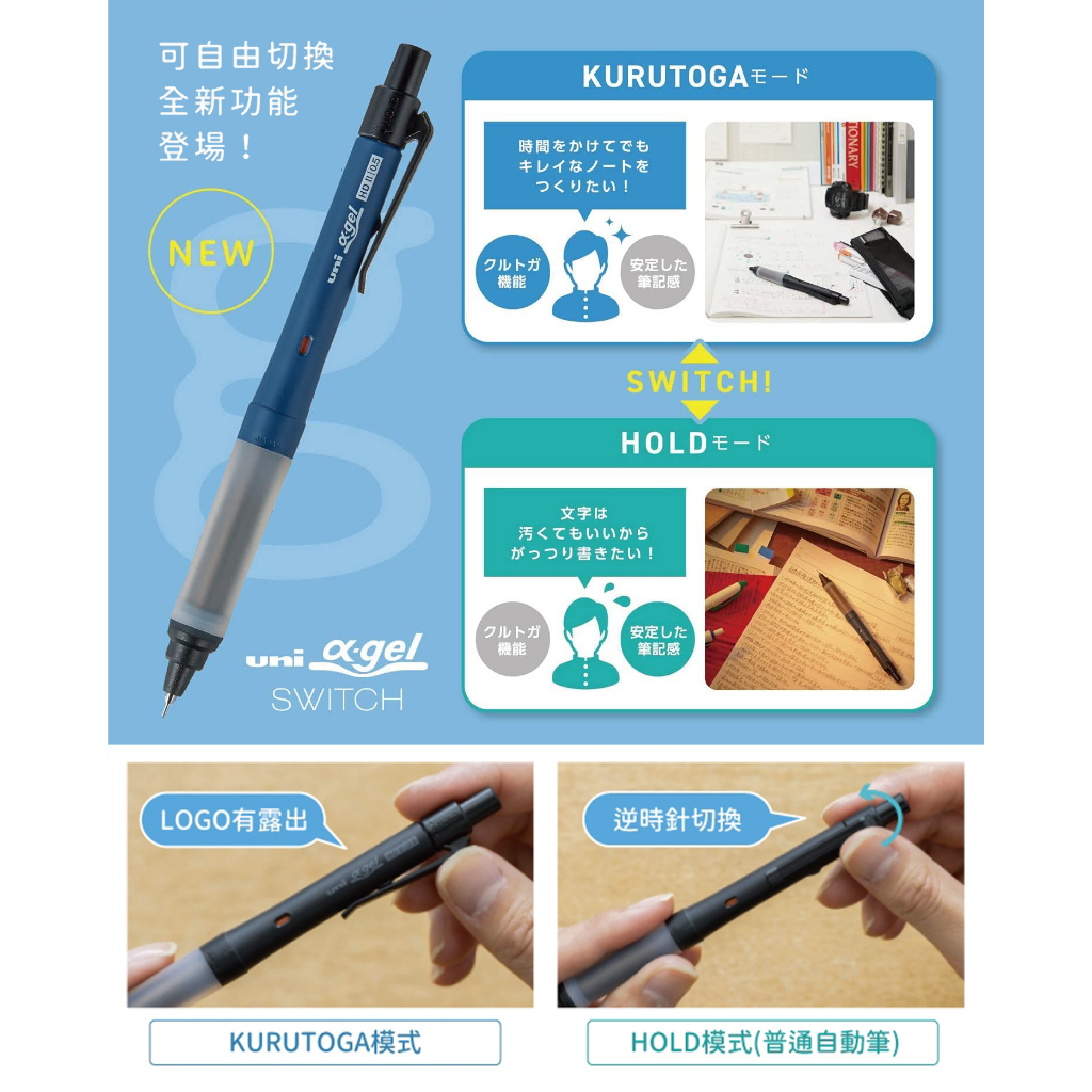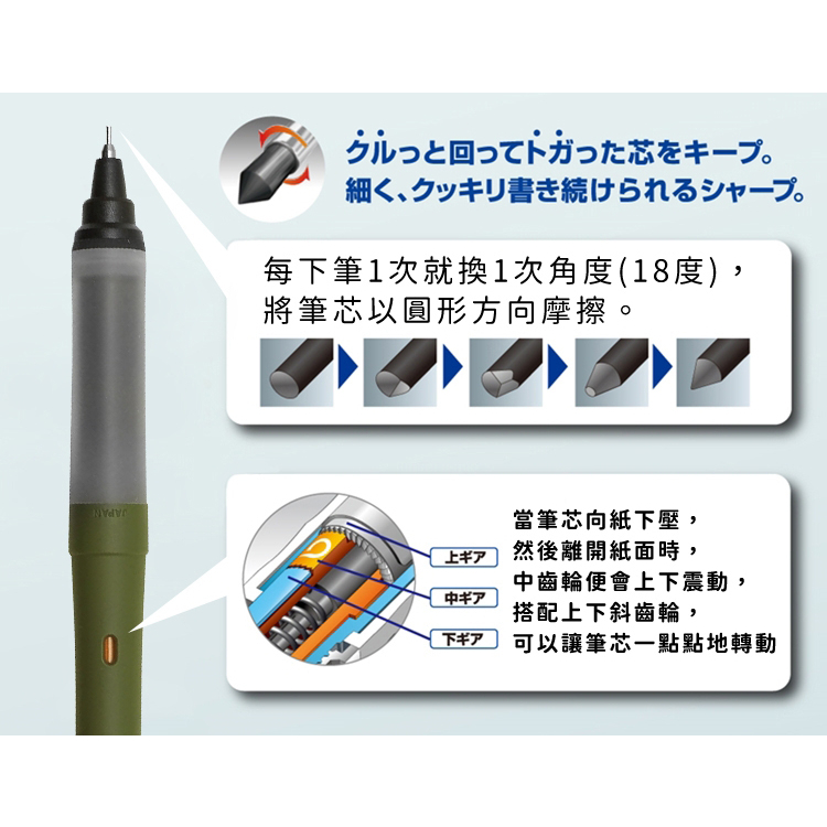 「筆芯持續旋轉的」KURUTOGA模式與「穩定書寫感」的穩定模式兩種任意切換。