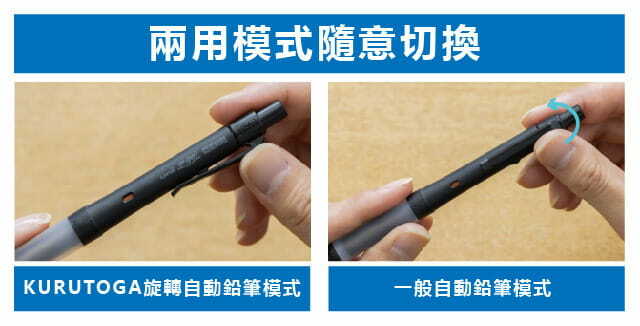 「筆芯持續旋轉的」KURUTOGA模式與「穩定書寫感」的穩定模式兩種任意切換。