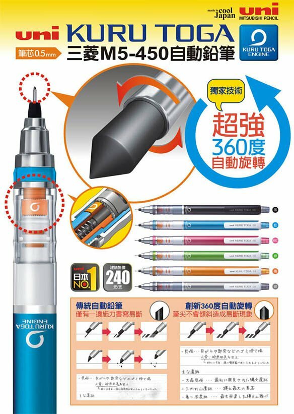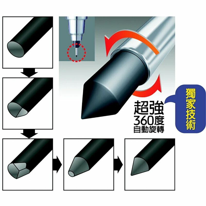 書寫時筆芯會自動360度旋轉,永遠維持尖銳狀