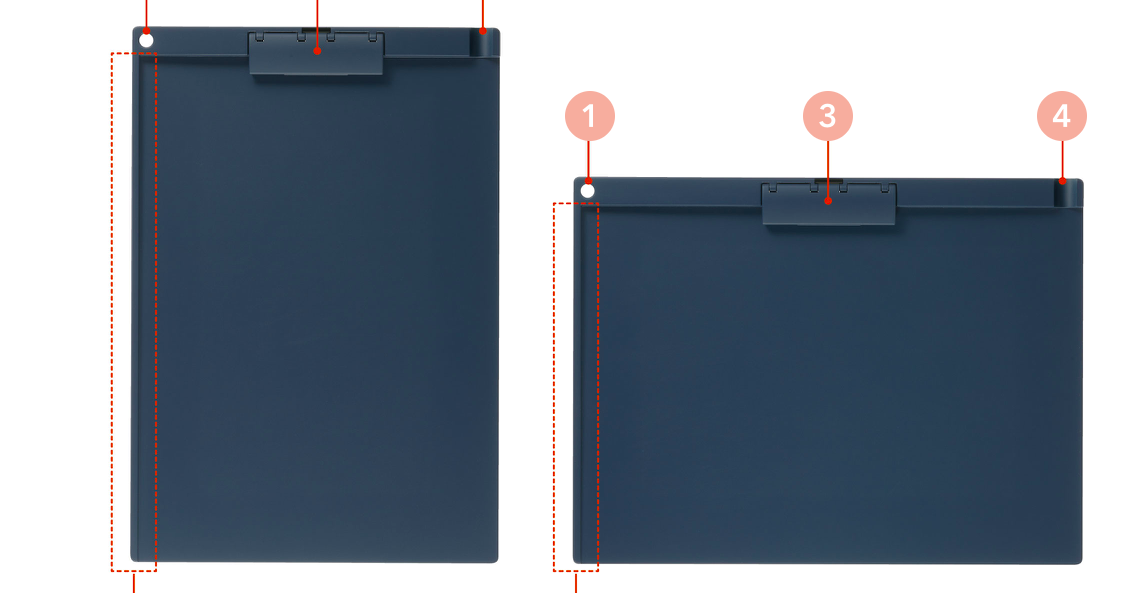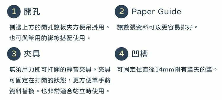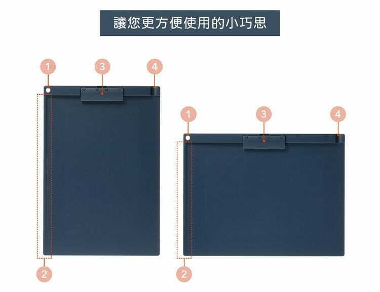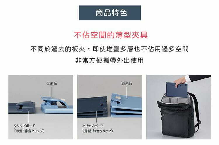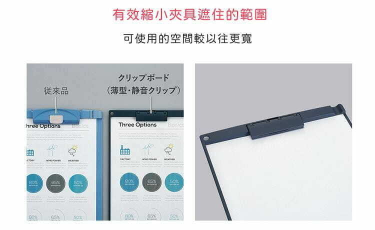 不佔空間的薄型夾具:即使多個板夾疊在一起也較過往的板夾不占空間,方便外出攜帶的尺寸。